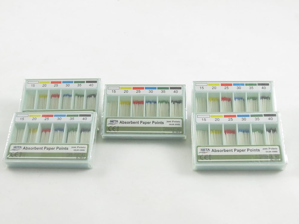 ABSORBENT & STERILIZED PAPER POINTS #15-40. Total Boxes: 5. Each Box Contains 200 Paper Points. Hand Rolled for Extra Absorbency: - Rigid enough to insert in canals without curling or bending - Rolled firmly to hold shape when withdrwan from the canal - Highly absorbent - Sterilized indiviudal pacakges - #15-40 #45-80 also available.