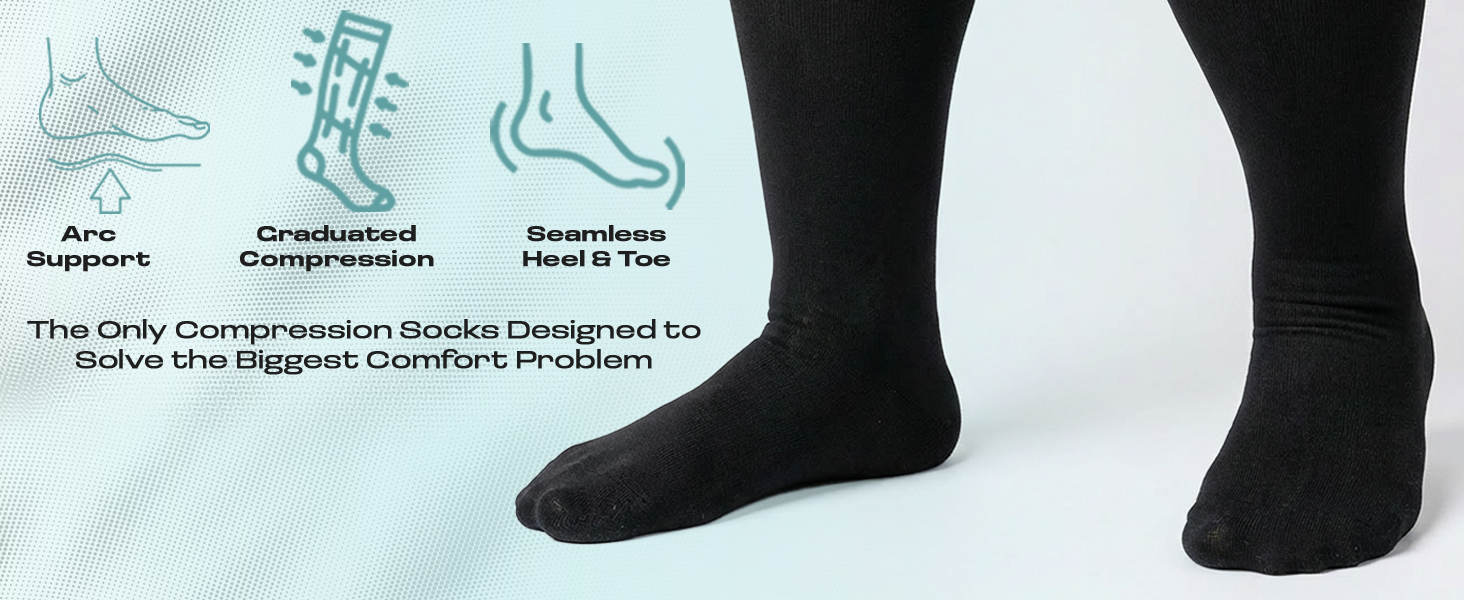 🍃 FIT FOR BIG, WIDE & SWOLLEN LEGS (L–8XL) - Made with a comfortable stretch and soft, high-quality fabric, these compression socks feel supportive without a tight or restrictive sensation. Designed for all-day wear, they help combat swelling while providing smooth comfort from the foot to the knee, leaving no marks on the skin.