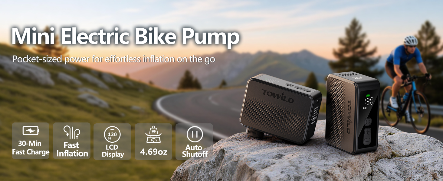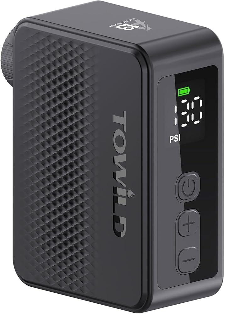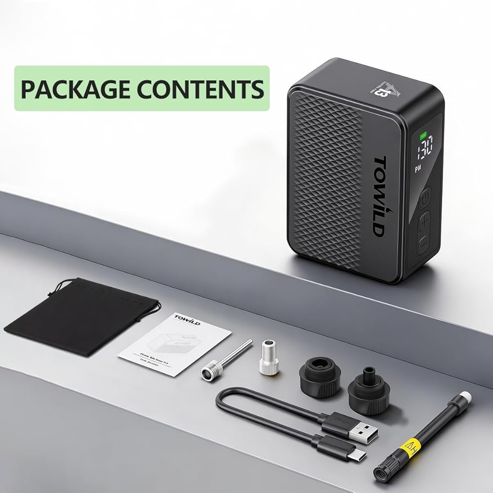 TOWILD A13 Mini Electric Bike Pump, 30Mins Fast Charging Portable Bicycle Pump with Gauge, 130PSI Small Air Pump for Bike Tires, Smart Auto-Off Tire Inflator Compatible with Road, Mountain & E-Bikes