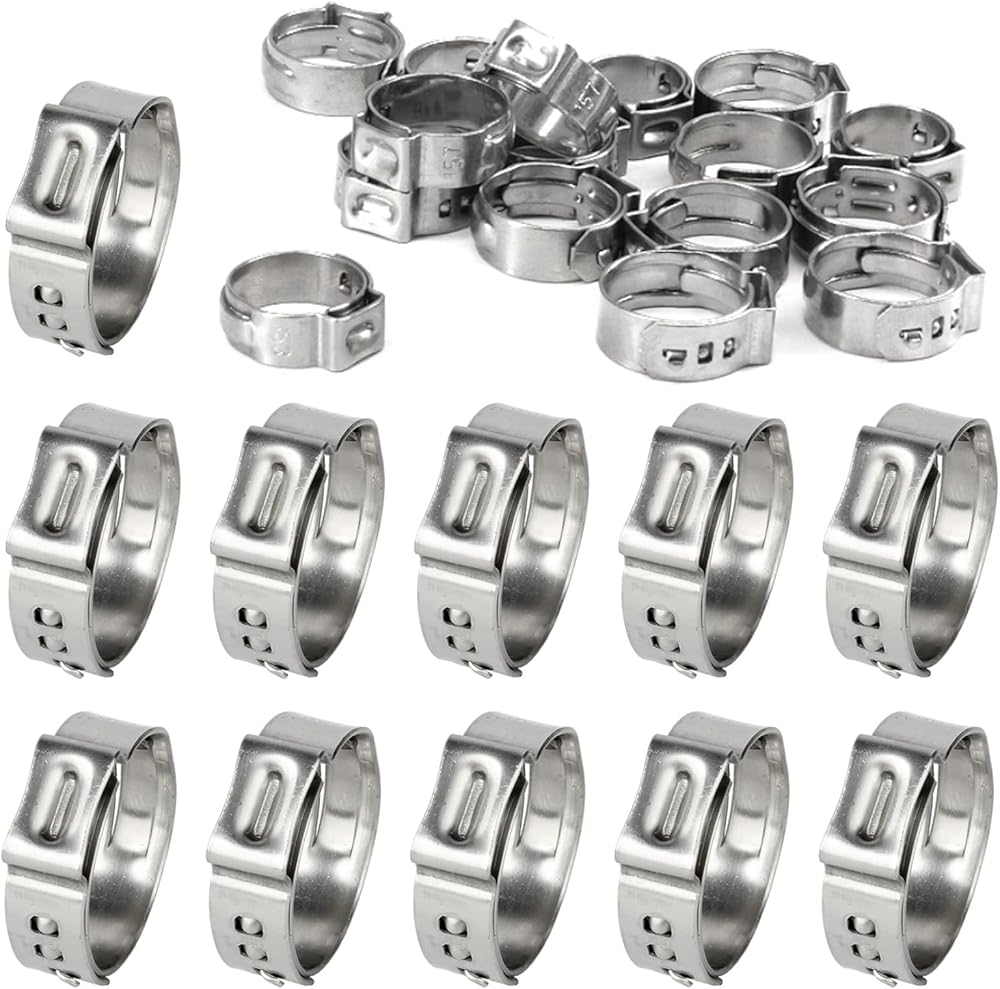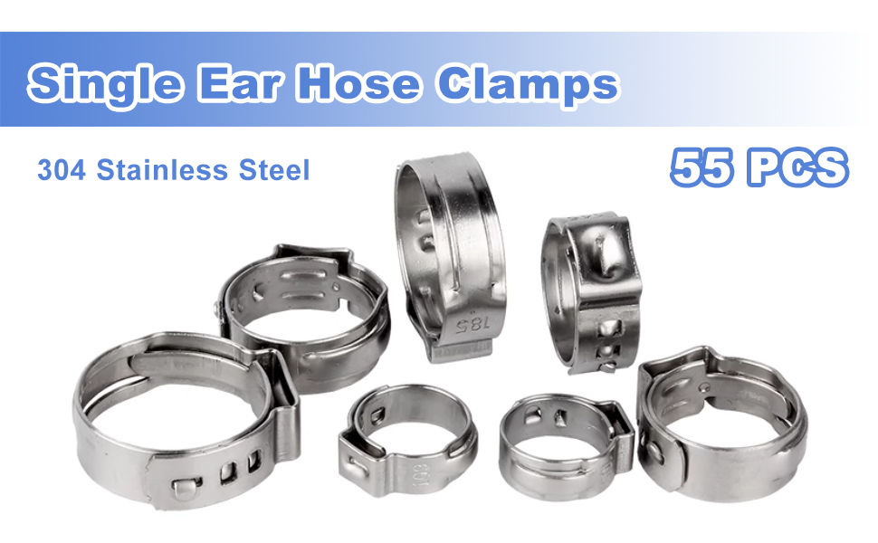 55Pcs 12.8-15.3mm 304 Stainless Steel Single Ear Hose Clamps Ear Stepless Hose Clamp Pinch Clamps Perfect for Automotive, Home Appliance Line and Plumbing