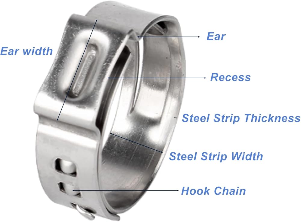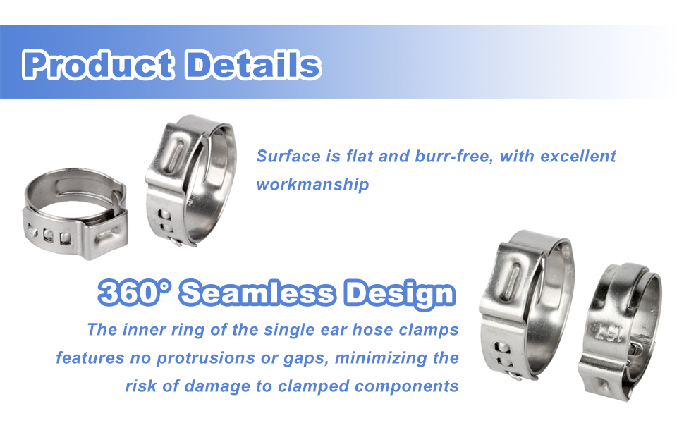 [Design]: The crimp hose clamp core structure of the single-ear clamp adopts a “stepless” design with no protrusions or gaps on the inner ring. It achieves sealing by applying uniform pressure over 360°, thereby adapting to pipe fittings made of different materials and solving the problem of uneven force distribution in traditional clamps. Ear stepless hose clamp has a spring effect that compensates for thermal expansion to exert continuous pressure around the clamp's diameter. Hose crimp clamps edge polished smooth, avoid damage to the hose.