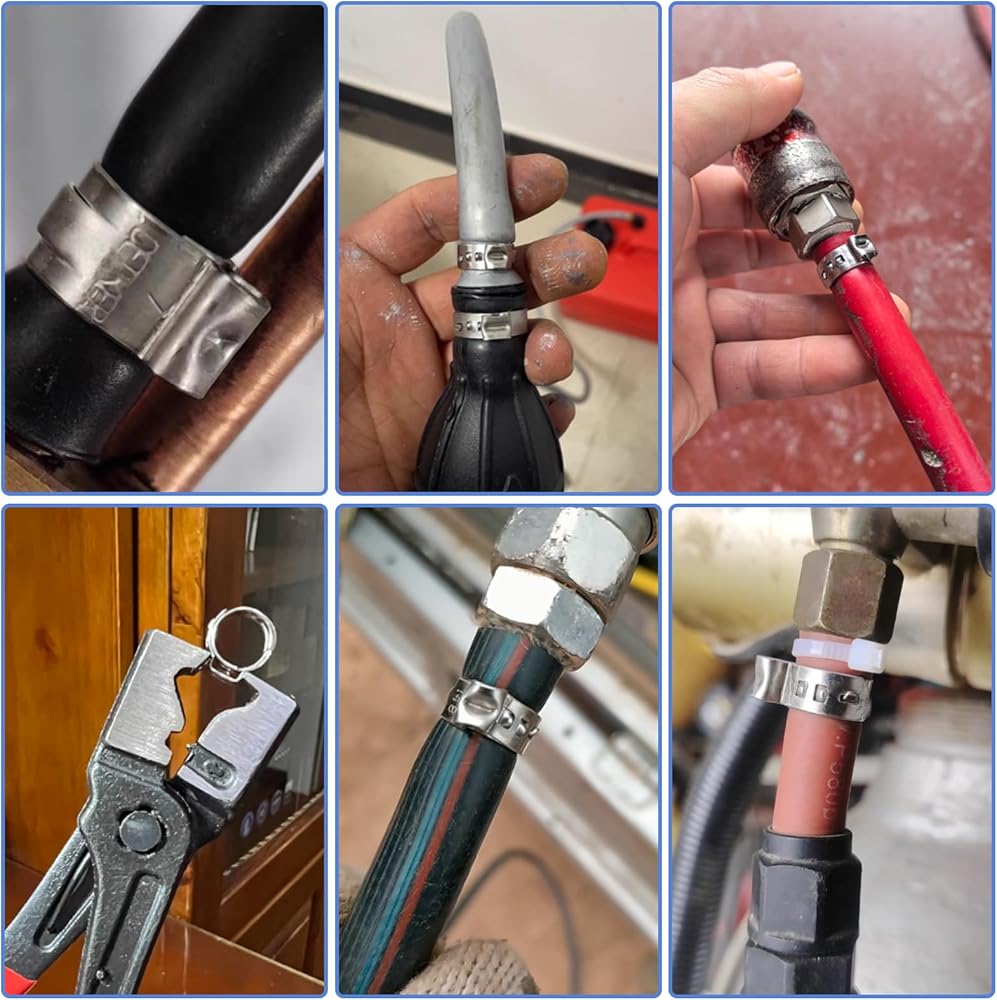 [Easy to Install]: First, push the crimp hose clamp into the rubber hose. Second, use a special tool to clamp it tightly. The degree of deformation can compensate for the tolerance of the hose hardware and adjust the surface pressure to control the clamping effect.