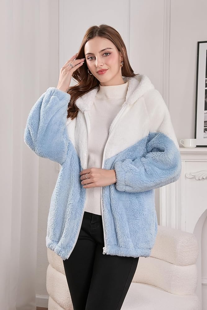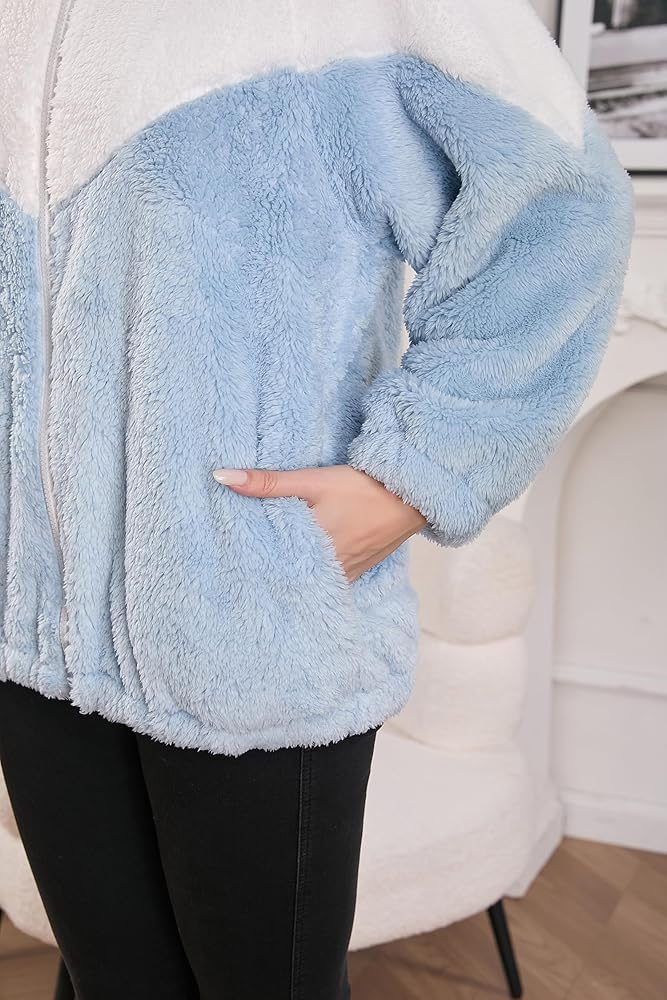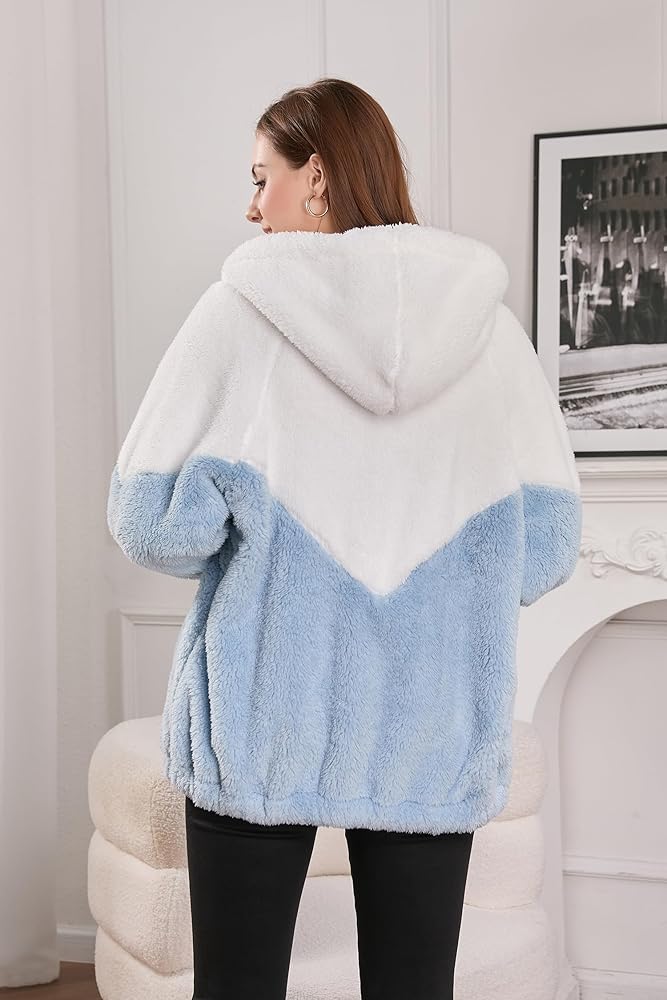 DESIGN FEATURES: Patchwork zipper hooded sweatshirt with two-color contrasting design, roomy pockets, and sleeve drawstring for style and functionality