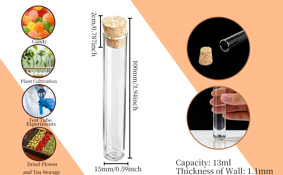 • Sufficient Capacity for Multiple Uses: The glass test tubes for plants offer an approximate capacity of 13ml providing ample space for multiple uses, whether you are conducting experiments, storing samples, candies, bath salts, chewing gum, jelly, chocolate chips, cookie nuts or creating crafts, and these test tubes for crafts can accommodate a wide range of applications as glass test tubes