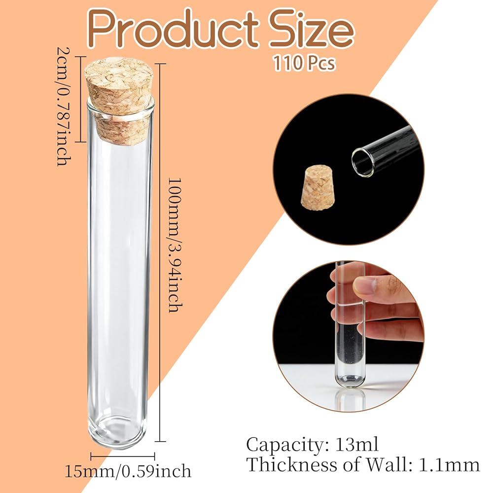 110 Pcs Glass Test Tubes with Cork Stoppers Lab Test Alcohol Tampons Glass Tubes Clear Round Bottom Vials Container for Candy Storage Party Favors Scientific Experiments(15x100mm/13ml)
