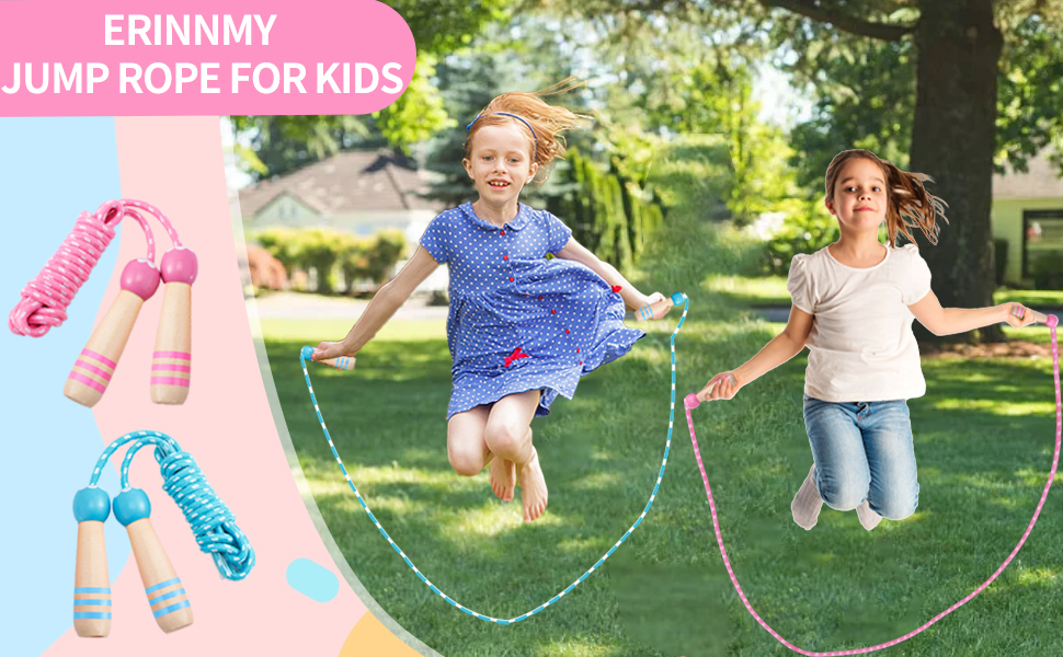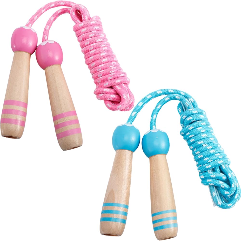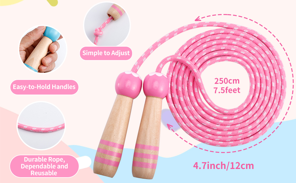Color Jump Rope Set: You will get 2 pack jump rope for kids, in 2 different colors, pink & blue color. The skipping rope with wooden handle is 8.2ft/2.5m length, which is long enough for many jumpers.