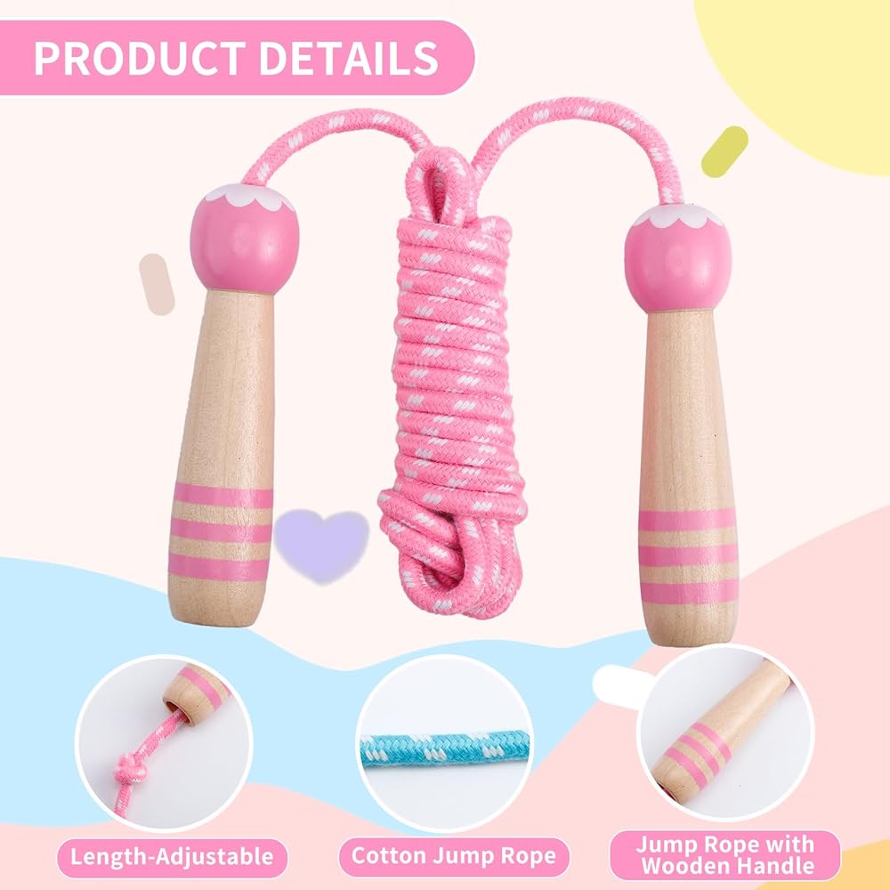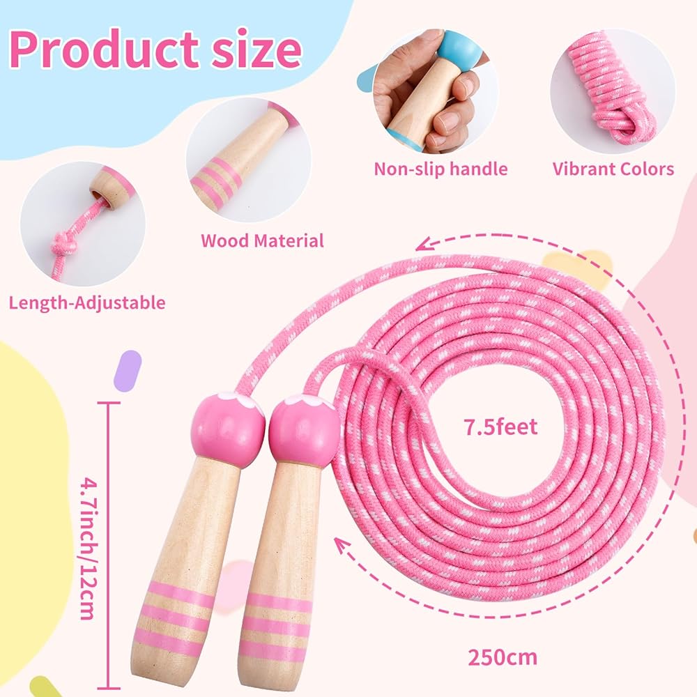Durable for Long Term Use: Kid skipping rope is equipped with a small wooden handle, the handle is streamlined, narrow in the front and wide in the back. Suitable for children's hands and is easy to hold. The kids jump rope made of soft cotton and high-quality natural wood handle, not easy to break, durable to serve you for a long time.