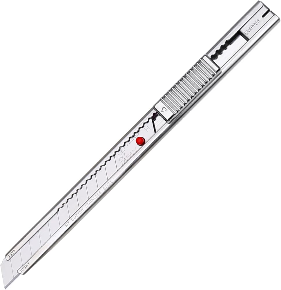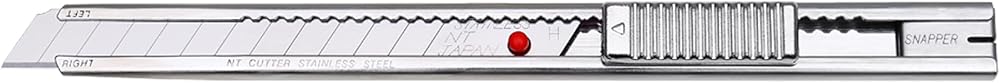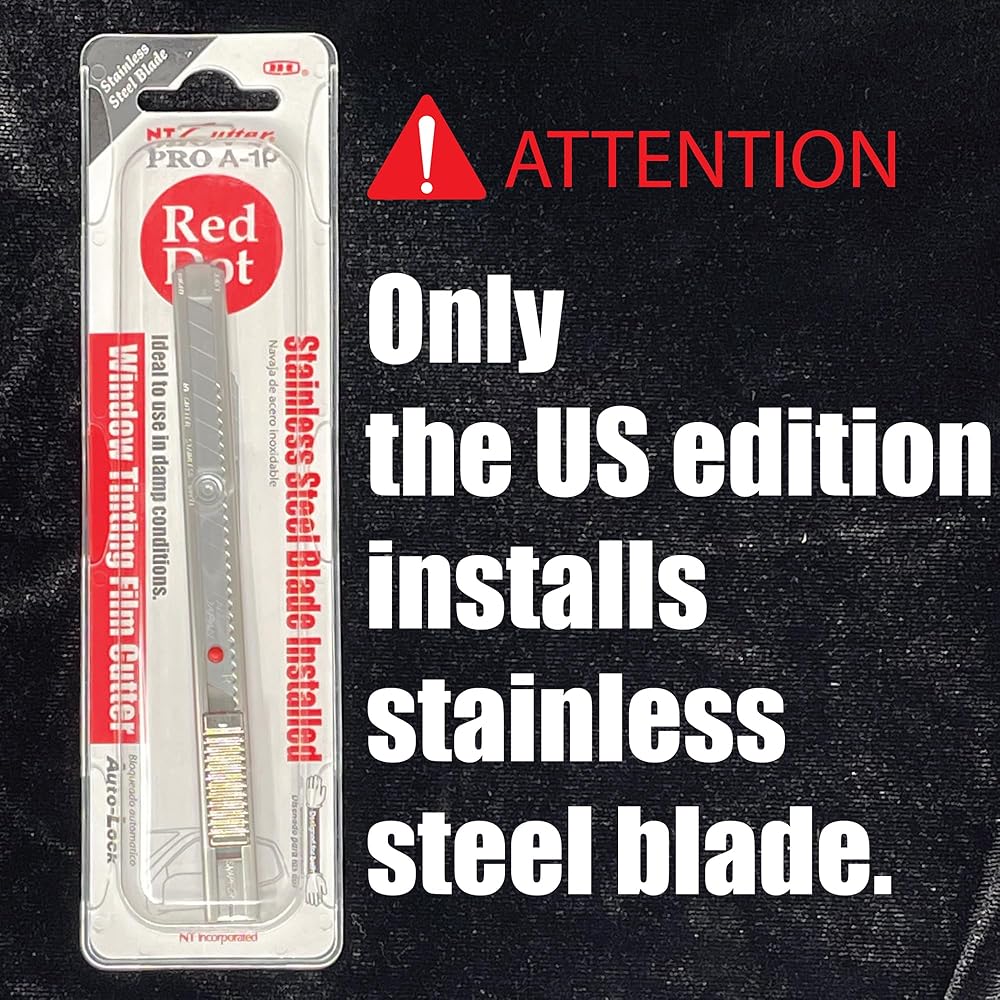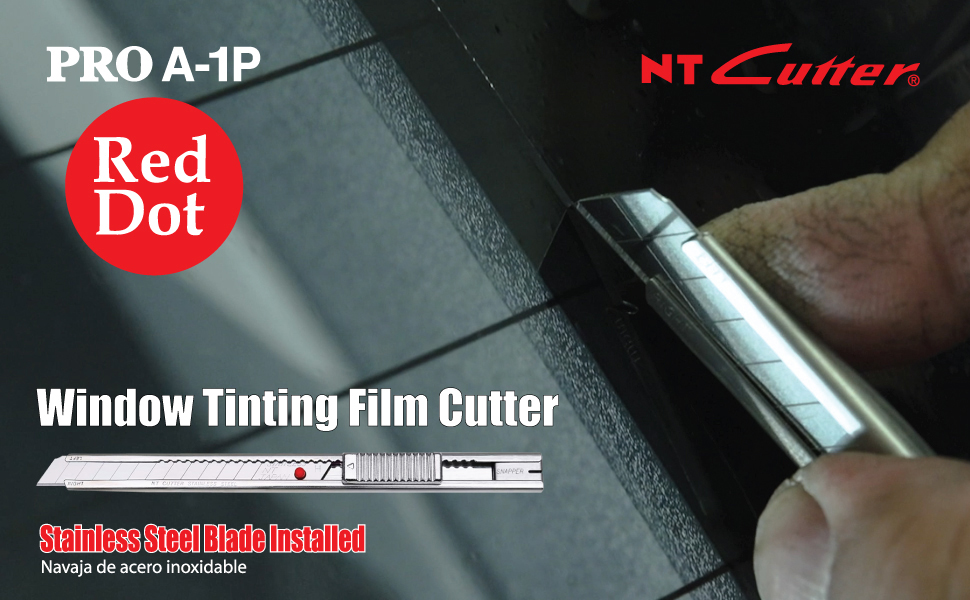 NT's Pro-line stainless steel knife is often referred to as the "Red Dot" knife in the professional window tinting business. This slim knife is ideal for free hand precision trimming jobs. For precision tinting, this window tint cutter is the premier choice amongst the professionals in the graphics industry. This rust resistant stainless steel holder now comes with NT's high-grade stainless steel blade which makes this the perfect tool for cutting damp window film, wallpaper, etc. Convenient snap off utility knife has an extra high quality stainless steel sliding track which allows the blade to glide in and out smoothly. Ratchet Auto-Lock slider will hold the blade secure for maximum cutting efficiency. End cap also functions as a blade snapper. Designed for right and left handed use with a simple reversal of blade. The blade used in this professional snap off knife is made of extra high quality stainless steel and produced through multiple stages of precise process to obtain the ultimate sharpness and optimum edge-retention. Made in Japan.