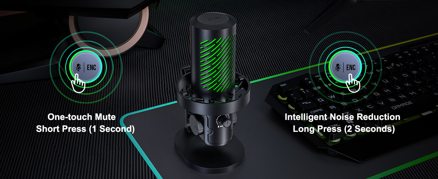 【Instant Touch Mute & Smart Noise Reduction】 Tap the top button for quick mute (red flashing LED indicator); long press 2 seconds to activate AI noise cancellation(green indicator) – eliminates background noise, keyboard clicks, and echo instantly; no more awkward live moments or noisy environments.