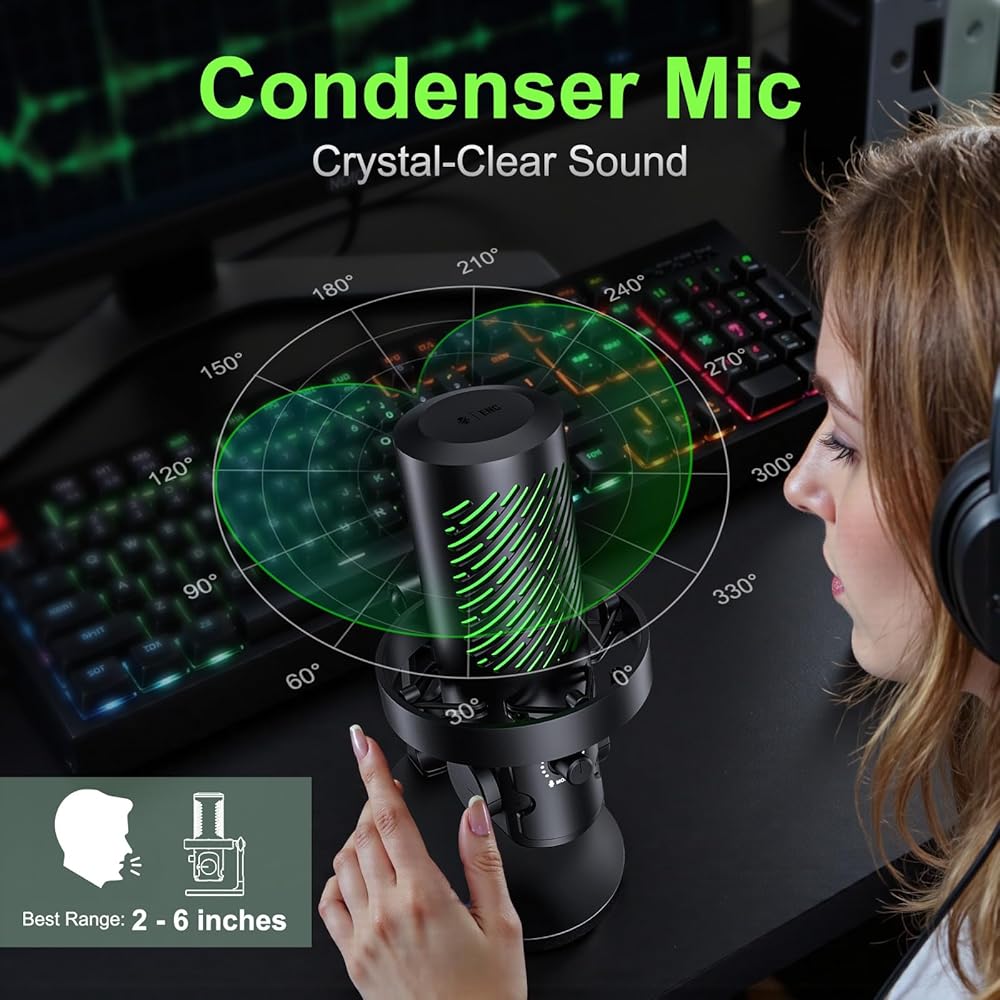 tenlamp RGB USB Condenser Microphone for Gaming Streaming Podcast - Cardioid with Touch Mute & Noise Reduction, Dynamic RGB Lights, Gain Knob, Headphone Monitoring, Plug and Play for PC Mac Phone