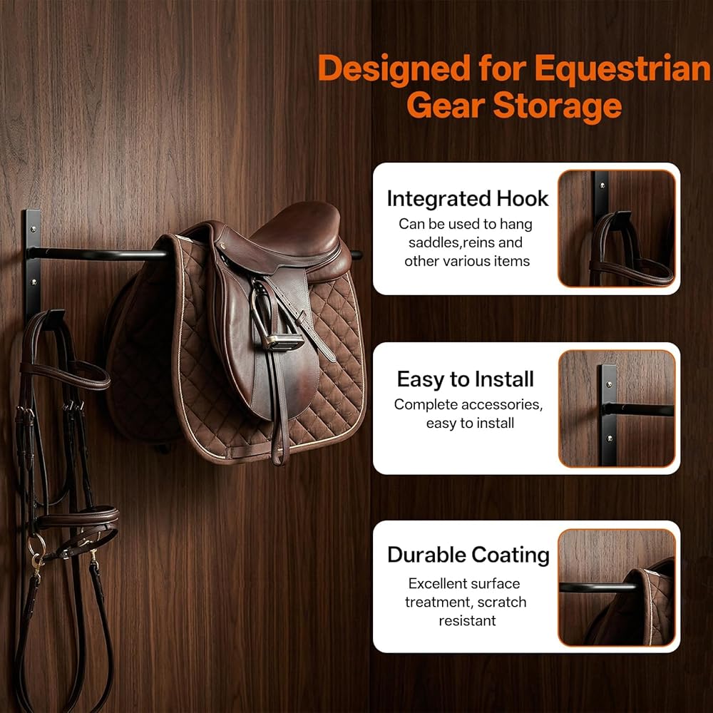 Ideal for professional stables and private horse owners alike, this practical rack system combines space-efficient design with rugged construction to keep your equestrian equipment properly stored and easily accessible.