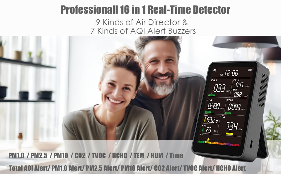 【Professional 16-in-1 Real-time Air Quality Monitor】: With real-time detection of PM1.0 | PM2.5 | PM10 | CO2 | TVOC | HCHO | TEM | HUM, plus 7 types of AQI alert and buzzer functions, this monitor ensures you always know what's in the air around you.