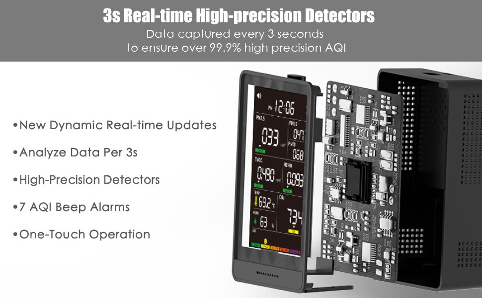【High-precision Sensor System & HD Large Display】: The high-precision sensor system continuously collects and analyzes air data every 3 seconds, providing you with constant updates on the air quality in your space. A clear and advanced color display enhances readability and adds a touch of sophistication to your environment.
