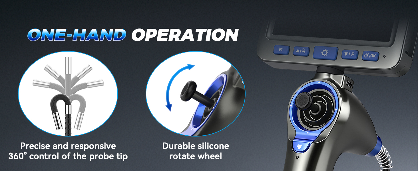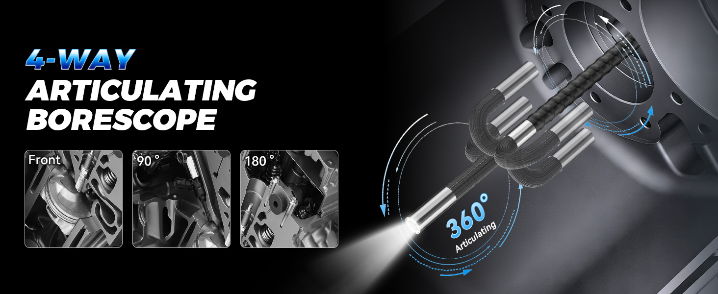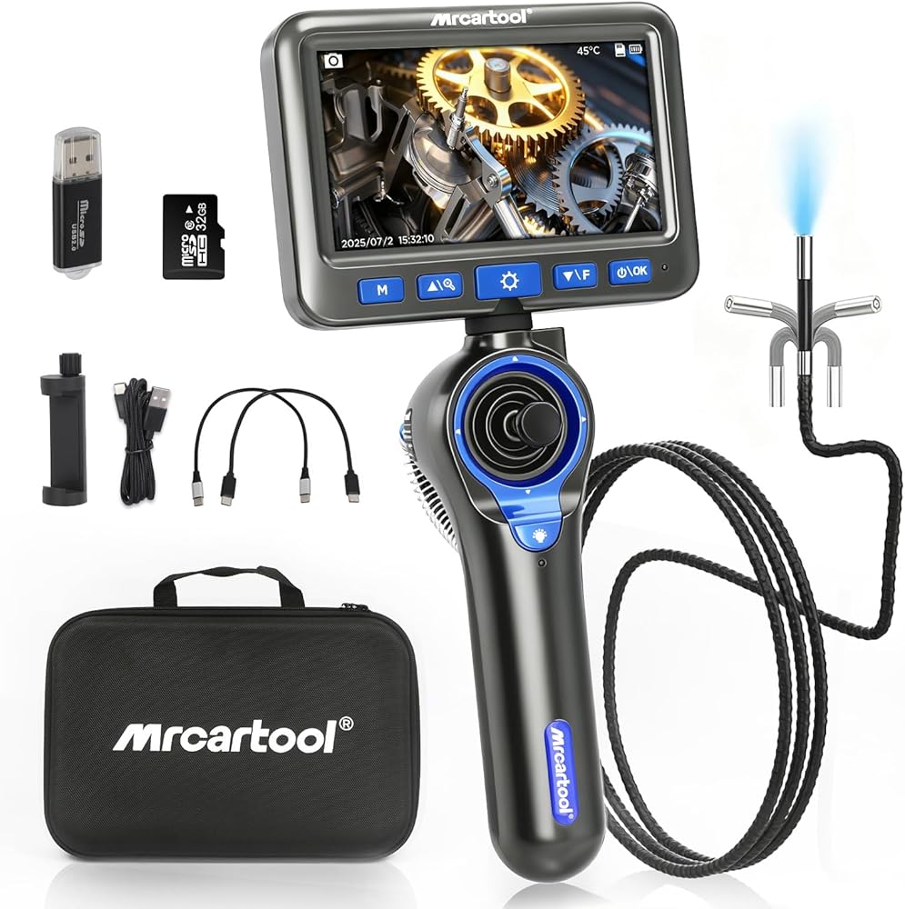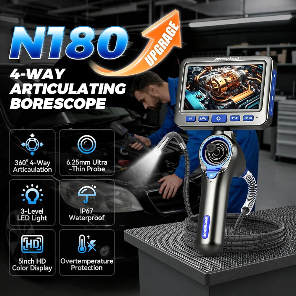 [4-WAY ARTICULATING BORESCOPE] MR CARTOOL N180 4-way articulating borescope features joystick control, enabling 360°rotation and 210° flexion of the probe for multi-angle non-destructive inspection inside engines, pipelines, and mechanical systems.