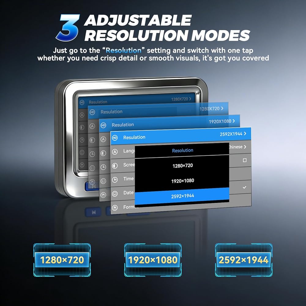 [3 ADJUSTABLE RESOLUTION MODES] The N180 borescope offers three resolution modes, 1280×720, 1920×1080, and 2592×1944, to suit any inspection task. Just go to the “Resolution” setting and switch with one tap: whether you need crisp detail or smooth visuals, it's got you covered.