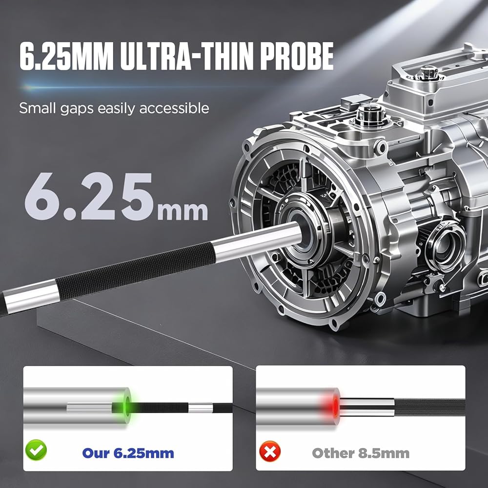 [6.2mm ULTRA-SLIM PROBE] Compared to 8.5mm probes, the N180's 6.25mm ultra-slim probe navigates effortlessly through narrow spaces without causing damage or blockage. It can bend, rotate, and lock at any angle, eliminating the need for manual cable twisting and enabling precise positioning.