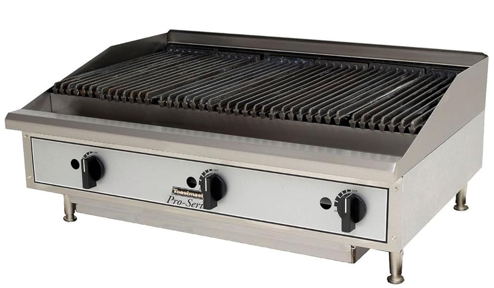 This Toastmaster Radiant Gas Charbroiler has a stainless steel front panel and reinforced aluminized steel side panels. It has 30,000 BTU burners every 12" of width, and comes in a 24" size. Its heavy-duty cast iron grates are reversible, with a thin side for searing and a thick side for more delicate food items. It stands on 4" adjustable legs.30,000 BTU U-style burners every 12" of width Heavy-duty cast iron grates can be individually positioned flat or slanted Grates are reversible with thin & thick side Heavy-gauge stainless steel radiants contoured for even heat distribution Standing pilot Large capacity stainless steel water pan 2.75" high tapered stainless steel splash guard Cool-to-the-touch stainless steel bullnose front Reinforced aluminized steel side panels 4" adjustable legs 3/4" NPT male connection 60,000 total BTU Grate depth: 20" Made in the USA Model #: TMRC24 6030823