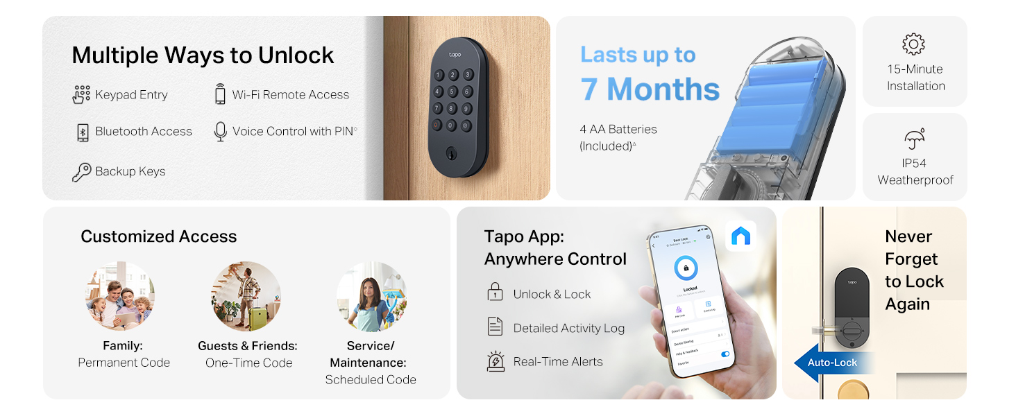 The Tapo DL100 Smart Door Lock is an affordable, reliable, and long-lasting home security solution. Powered by AA batteries (included), it offers up to 200 days of battery life. Featuring keyless tactile entry, it lets you easily manage access for family, guests, and maintenance staff without the need for physical keys. The Tapo app keeps you in control with remote locking and unlocking, real-time notifications, and activity logs. With auto-lock functionality, the lock automatically secures your door after each use, ensuring your home is always protected. Built for durability with BHMA Grade 3 certification and an IP54 weatherproof rating, this deadbolt smart lock withstands daily wear and outdoor conditions. Plus, it seamlessly integrates with Alexa, Google Home, and Samsung SmartThings for voice control. The product dimensions of the outdoor lock are 5.88 x 2.65 x 2.2 inches and for the indoor lock are 10.51 x 2.84 x 1.81 inches. Whether you're a frequent traveler, busy professional, or parent on the go, this smart lock is designed to offer effortless home or business security. In addition, the lock's firmware updates automatically to ensure it stays up-to-date. The Bluetooth specifications include 1M and 2M. The package includes everything you need for installation: the outdoor lock, indoor lock, bolt, strike plate, dust box, 2 installation reference line stickers, mounting plate, 4 AA/LR6 batteries, 2 keys, silicone cover, measuring template, quick start guide, and screws. Operating in temperatures ranging from -22°F to 158°F and with a humidity range of 10%-90% RH, the Tapo DL100 is built to perform in various environmental conditions. The lock also allows customization of its chime ringtone and volume.
