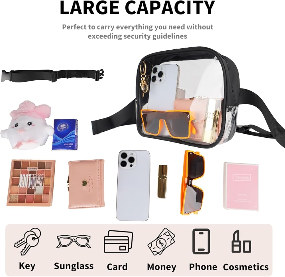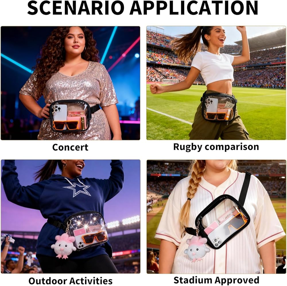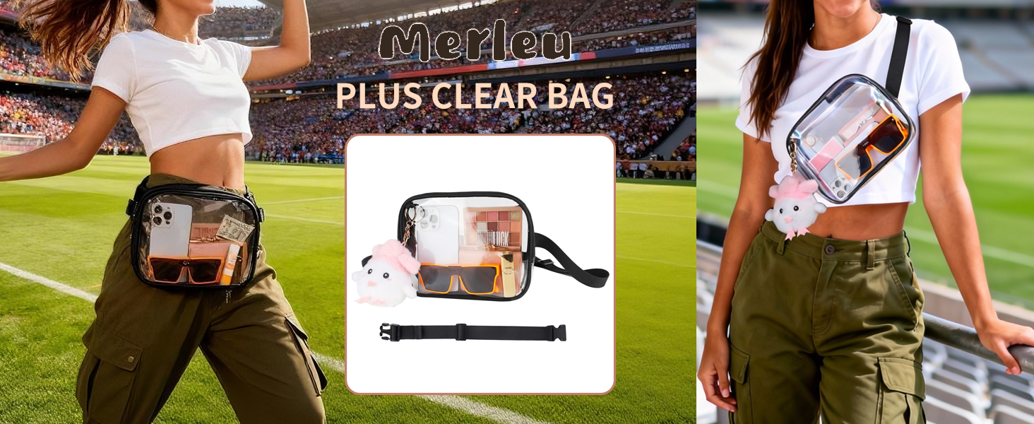 【Designed with a Metal Keychain】 The Merleu clear fanny pack features a built-in metal keychain, allowing you to attach your favorite charms, plush toys, or accessories, Perfect for adding a personal touch to your stadium-approved clear belt bag when heading to games, cancerts, or festivals. This functional yet fun clear fanny pack purse is designed for quick entry at venues with clear bag policies, keeping your essentials secure while letting your style shine. Enjoy hands-free convenience with a bag that's both practical and personal.