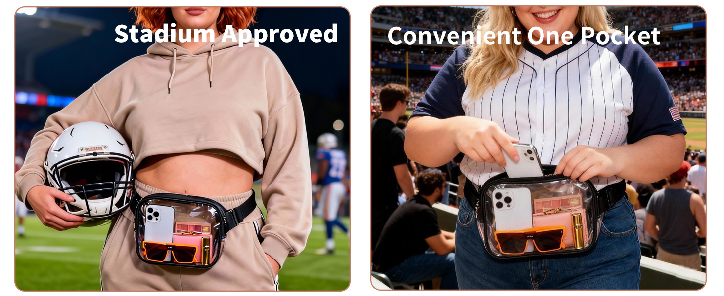 【Clear Bag Stadium Approved & Perfect Size】The lerleu Clear Fanny Pack measures 9.44"L x 7.28"W x 2.56"H, fully compliant with the strict 12"x6"x12" clear bag policy for hassle-free entry. This clear fanny pack ensures quick security passage at stadiums, concerts,festivals, airports, and workplaces.