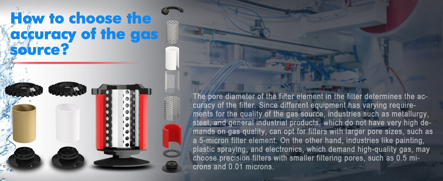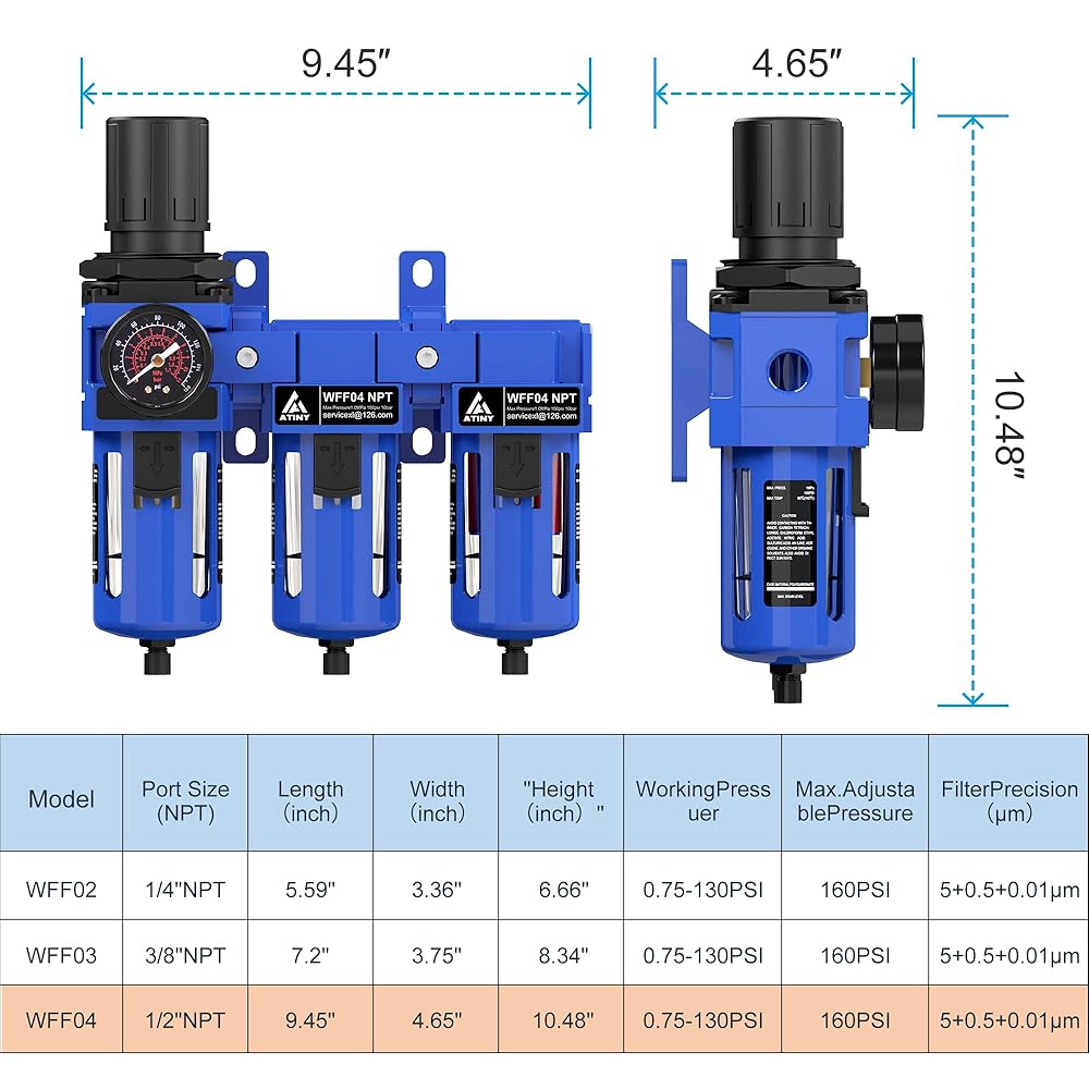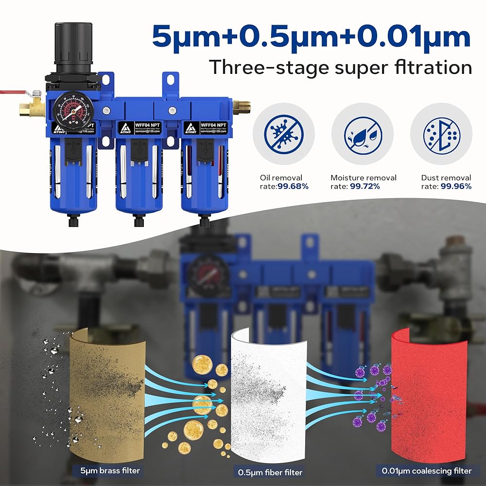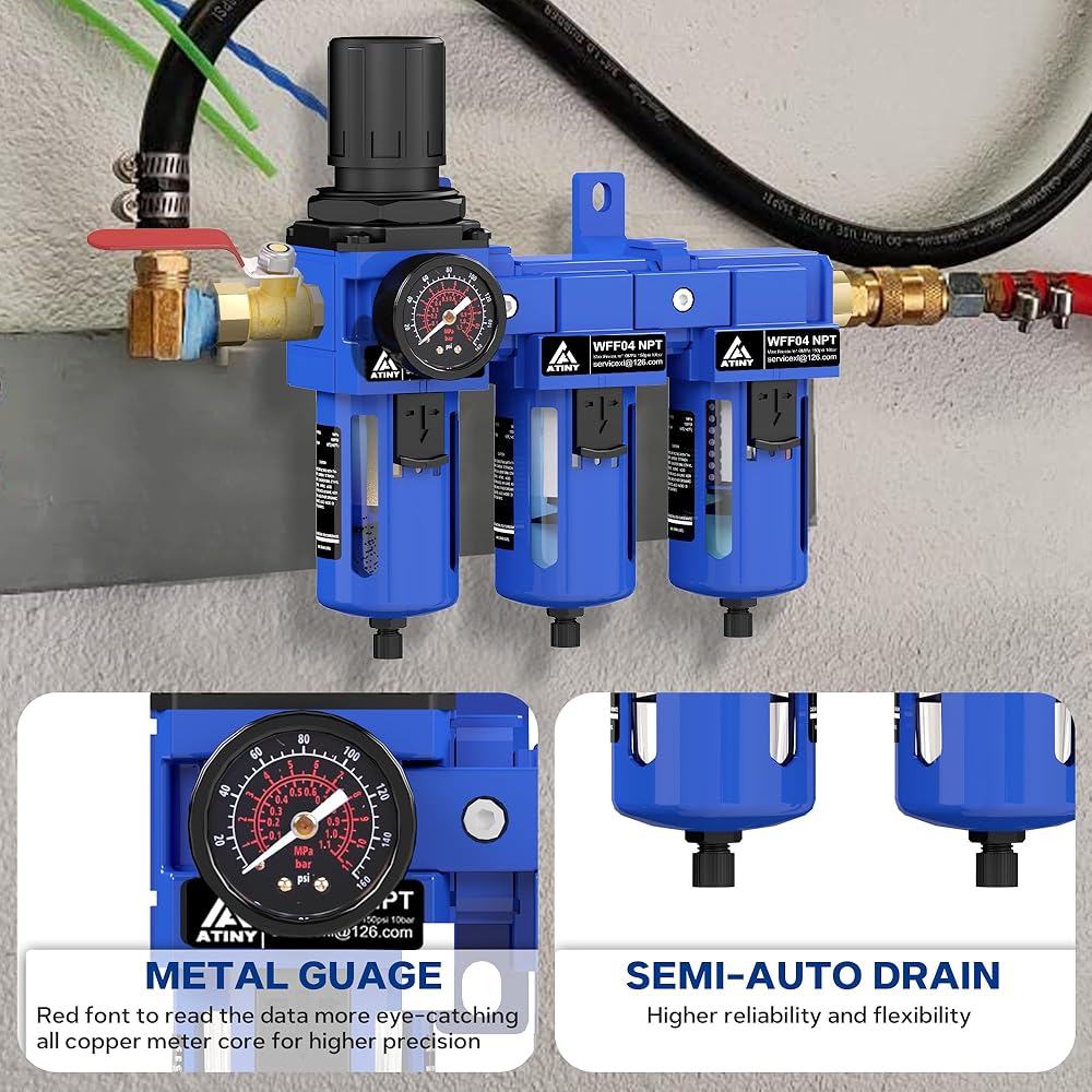 【Three-in-One Filte Element】three stage Air filter regulator fitted with a 5u brass filter, a 0.5u fiber filter, and a 0.01 coalescing filter, these components effectively eliminate moisture, particles, and oil, significantly extending the lifespan of your pneumatic equipment while ensuring top-notch filtration performance