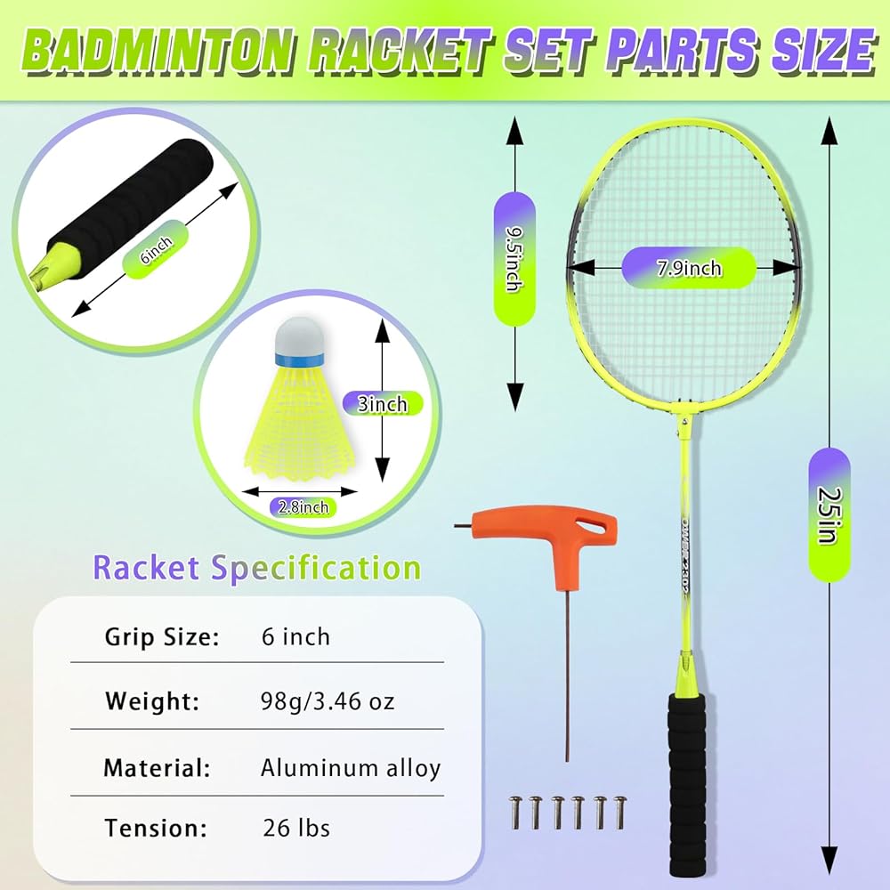 【Upgraded Badminton Racket Set of 2】Badminton racket one piece measures 25 inches in total length, featuring an enlarged sweet spot with a head size of 9.5 inches long and 7.9 inches wide for a more comfortable hitting area. Each racket weighs 98g (approx. 0.216 lbs). While most rackets on the market range from 105g to 120g, our badminton sets for backyards offers a lighter feel for more agile play. The handle features a built-in 6-inch sponge grip designed for ergonomic comfort.
