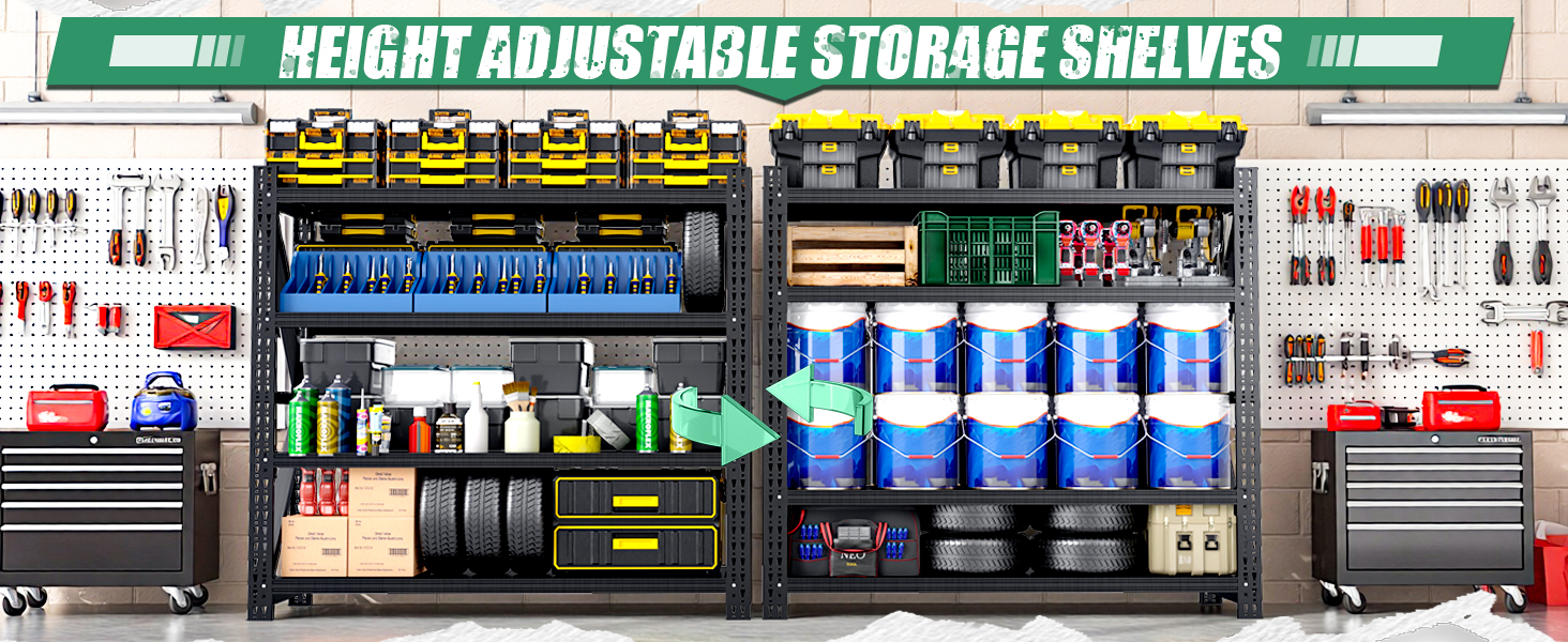 Engineered for Rock-Solid Stability – Say goodbye to wobbling shelves. Our large garage shelving features adjustable leveling feet to compensate for uneven floors, plus pre-drilled wall anchor holes to securely fasten the unit and prevent tipping. Whether you're organizing a busy workshop or a family garage, this garage racks for storage stands firm under heavy loads.