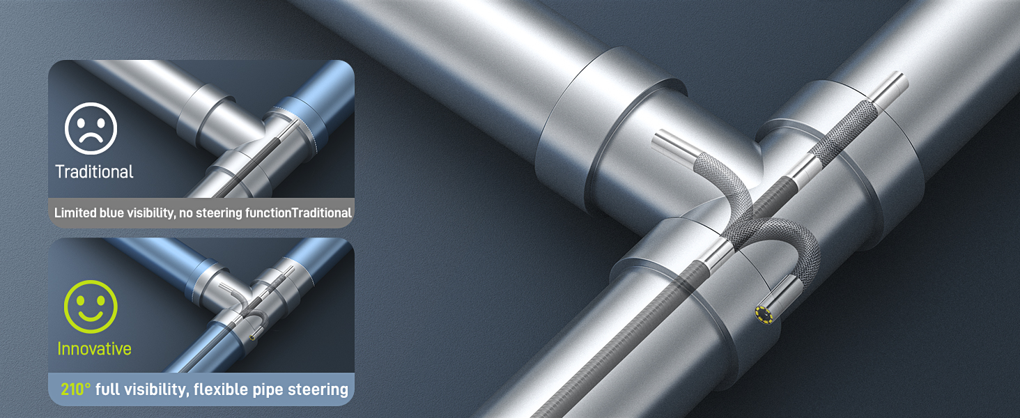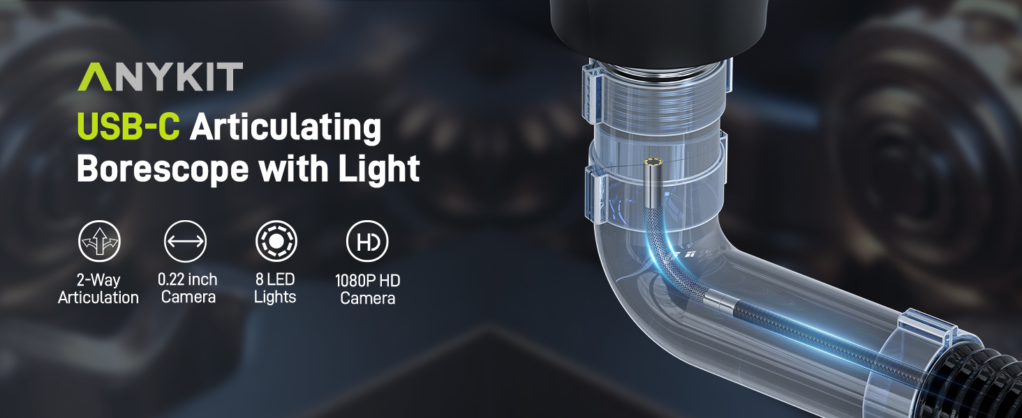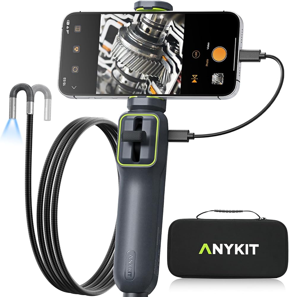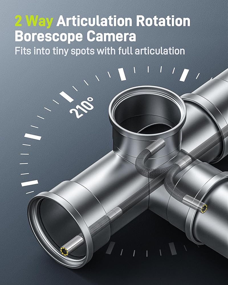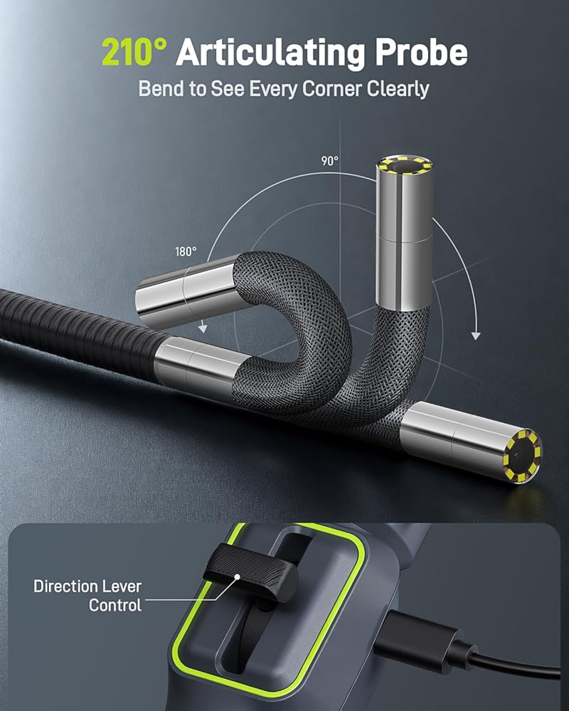 【360° All-Around View with Two-Way Articulation】Stop struggling with blind spots! Our upgraded articulating borescope features a highly responsive steering wheel that allows the 0.22in probe to bend up to 210° in two directions. This flexible "snake" design enables you to navigate through complex engine cylinders, tight wall cavities, and curved pipes with ease, providing a full 360° inspection view without the need to rotate the entire cable.