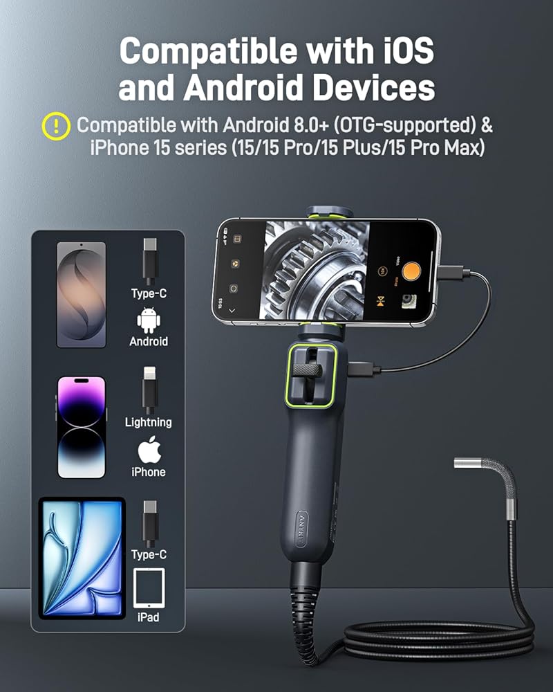 【Plug & Play via USB-C: iPhone 15/16 & Android Support】Transform your smartphone into a high-definition inspection tool instantly. Designed for the latest devices, this endoscope features a direct USB-C connection, making it perfectly compatible with iPhone 15/16 series, USB-C iPads, and Android 8.0+ devices (with OTG). Simply plug it in, launch the recommended app, and enjoy real-time HD viewing on your phone's vibrant display.