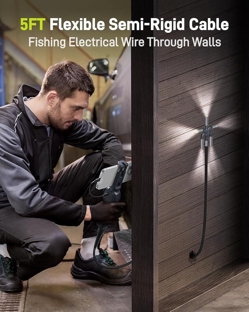 【Flexible Semi-Rigid Cable】The 5FT flexible semi-rigid cable is perfect for accessing narrow nooks and crannies, paired with 8 adjustable LED brightness levels, it ensures clear visibility, controlled by long-pressing the photo button, cycling through bright, medium, dim, and off modes.