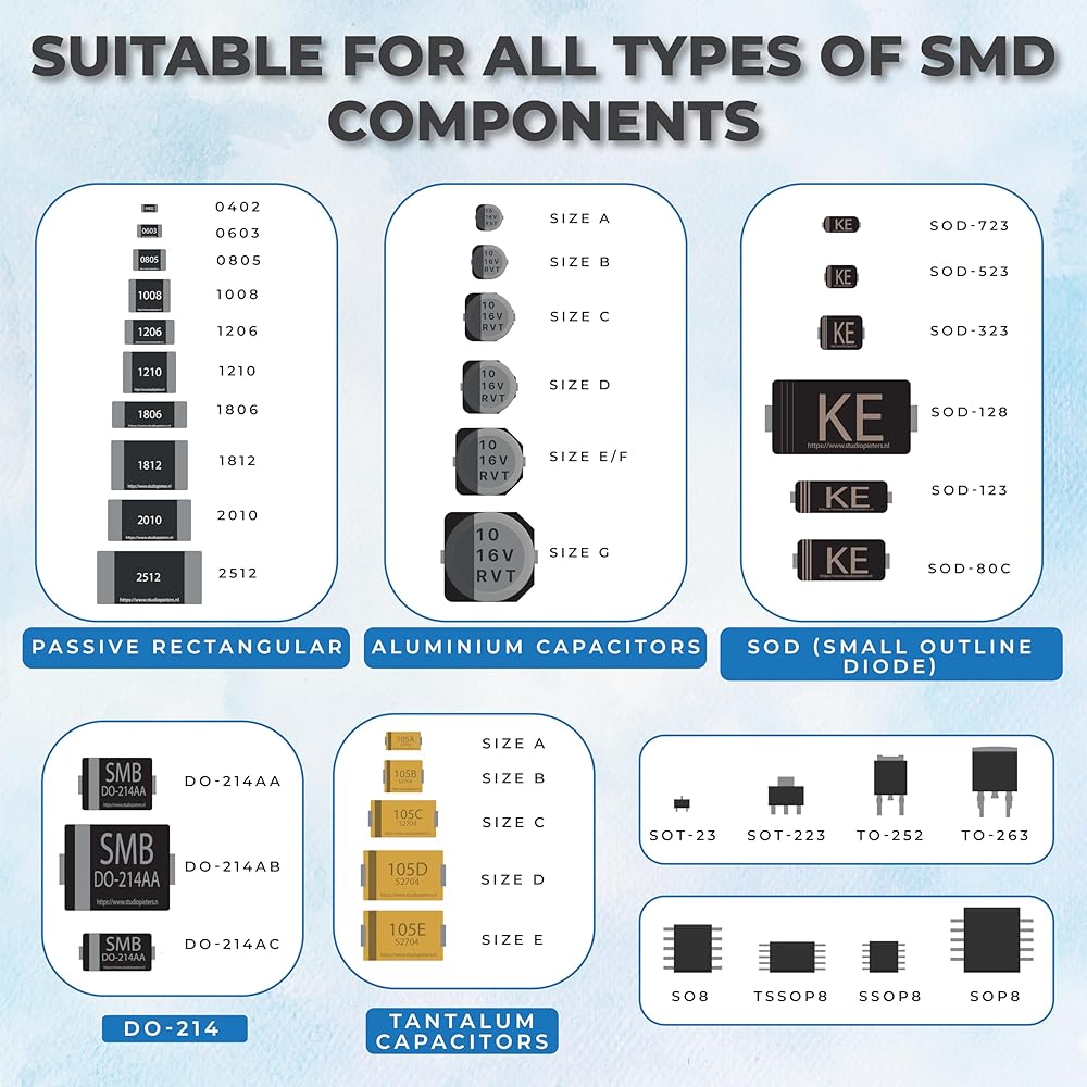 📦 COMPLETE ACCESSORY SET: This bundle includes the vacuum pen, the protective travel case, a USB-C cable , and a versatile set of 6 interchangeable nozzles and 3 suction cups (sizes 3.5mm and 10mm). Perfect for handling a wide range of electronic components with an ergonomic, anti-fatigue grip.