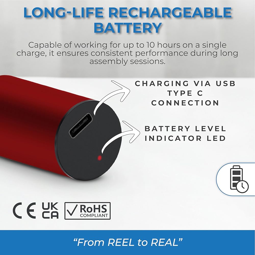 🔋 10-HOUR CORDLESS OPERATION: Equipped with a built-in 465mAh Li-Po battery , this tool provides up to 10 hours of continuous use on a single charge. It features USB-C fast charging and LED status indicators, ensuring your tool is always ready for long work sessions without cable clutter.