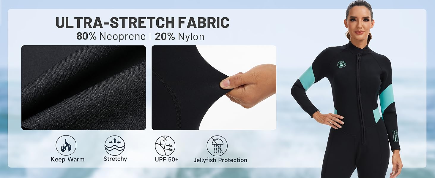 【SUPER-STRETCH CR NEOPRENE】Crafted with high-stretch CR neoprene, our 2mm wetsuits offer 200% more flexibility than standard neoprene, providing exceptional freedom of movement for swimming, surfing, diving, and kayaking