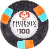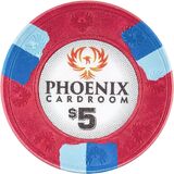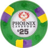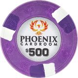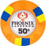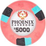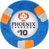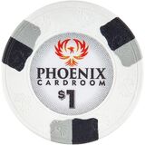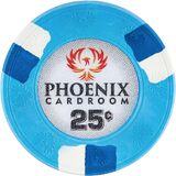 Phoenix Card Room poker chips are top-of-the line casino-grade clay poker chips that don't use any plastics or polymers. Unlike most poker chips on the market, each Phoenix chip is 100% clay, like all the best vintage casino chips of yesteryear. Stamped with a decorative Phoenix mold design, each 10-gram chip features a colorful two-spot edge design inspired by classic casino chips from across the USA. Each poker chip feels great in the hand, because real clay lends our Phoenix chips a subtle earthy texture and additional heft not found in cheaper plastic poker chips. Did You Know? Casino chips traditionally only weigh 10 grams! Home players who were used to 2-gram plastic chips would visit casinos and feel the heavier chips for the first time. They'd come home, demand heavier chips, but chip manufacturers ended up with 13.5-gram "heavyweight" chips with a metal slug in the center. If you're looking to bring the authentic casino experience to your game room, bring home Phoenix poker chips. The full Phoenix collection includes ten cash denominations: $0.25, $0.50, $1, $5, $10, $25, $100, $500, $1000, and $5000.