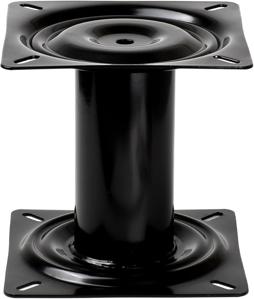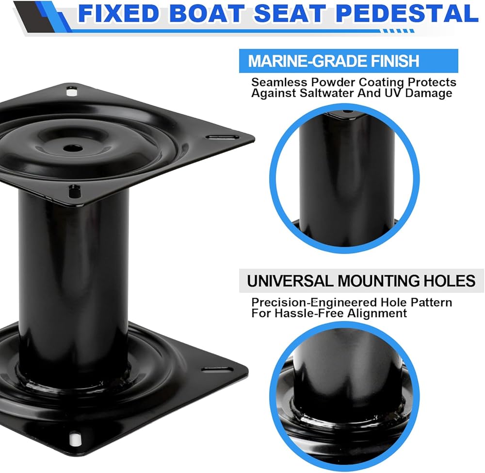 This 7-inch boat seat pedestal provides a sturdy, non-swivel mounting solution for marine seating applications. Constructed from high-quality carbon steel with reinforced welded joints, this pedestal is built to deliver exceptional strength and durability in demanding marine environments. The black powder-coated finish resists corrosion and weathering, ensuring long-lasting performance on the water. Featuring integrated base and seat mounting plates, this pedestal accommodates hole mounting patterns ranging from 4.85 inches to 6 inches, making it compatible with most boat seats. The fixed design securely holds your seat in place, providing stable seating whether you're fishing, cruising, or navigating. Installation is straightforward with pre-drilled holes in both the top and bottom plates - simply align with your desired location and secure with pan head Phillips screws. With product dimensions of 7 inches in height and 7 inches in width and length, this economy pedestal offers reliable functionality for various boat seating configurations.