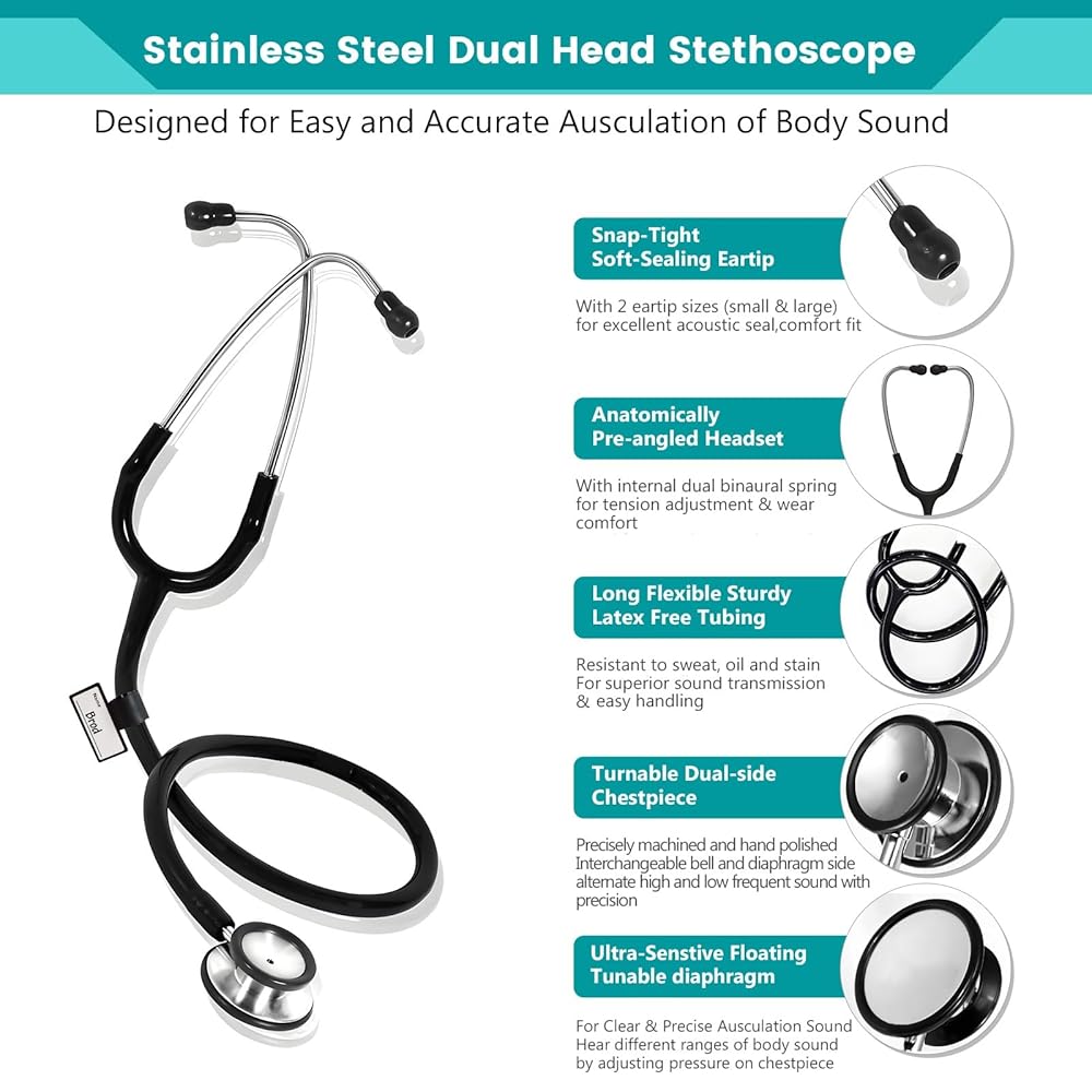 ✅Precision -With ultra sensitive, precision machined stainless steel double-sided chestpiece, stainless steel stethoscope detects even the faintest body sounds with clarity. The ergonomic headset with dual leaf spring and soft sealing ear tips is tension-adjustable and pre-angled to fit the ear snugly, creating a complete acoustic seal for maximum sound quality