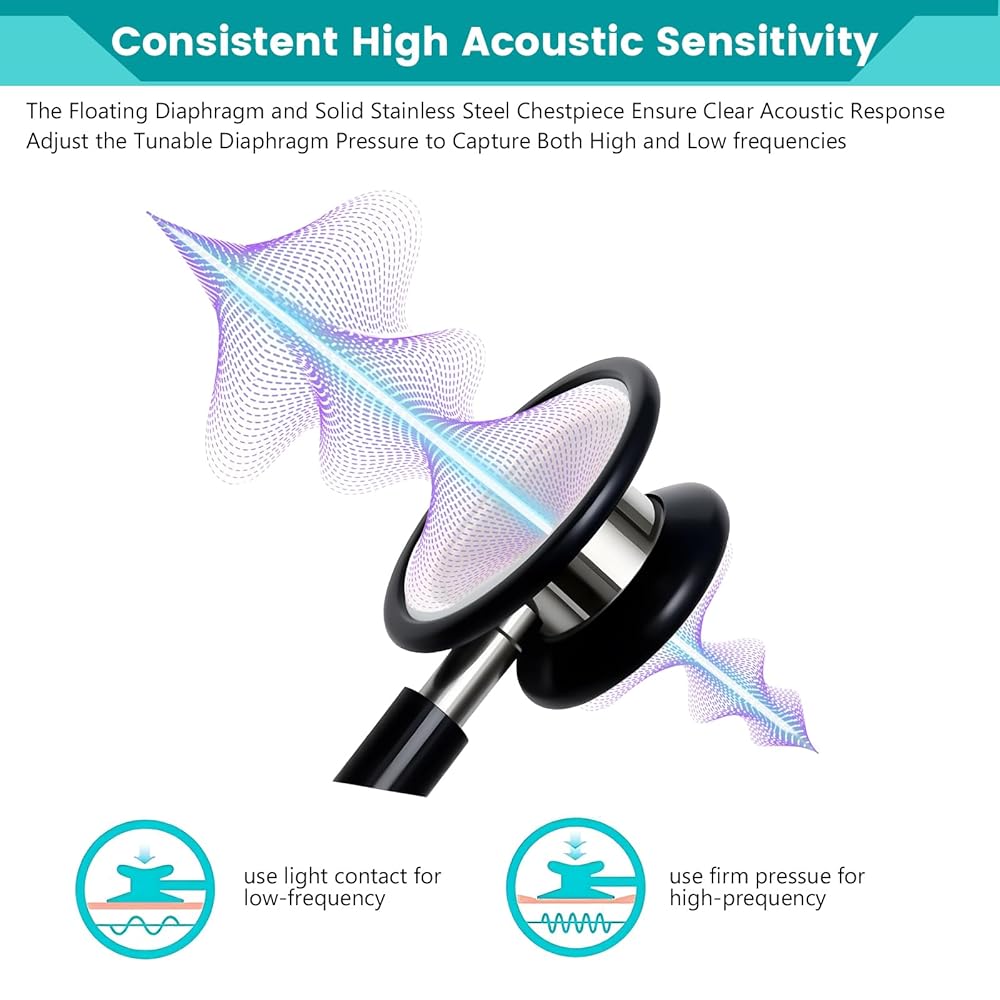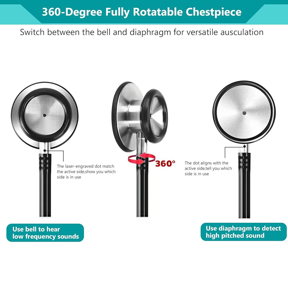 ✅Versatile Sound Auscultation -Dual head stethoscope is designed with swivel two-sided chestpiece and advanced floating diaphragm to capture low or high-frequency sounds and hear a wide range of body sounds. Rotating the head allows the use of the bell or diaphragm side for optimal frequency. The tunable diaphragm responds to simple pressure changes switch between low and high frequencies for various scenarios