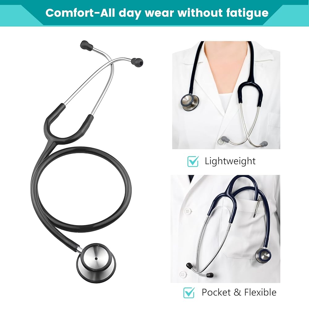 ✅Excellence in Comfort -Comfort is key during long shifts. Portable stethoscope is lightweight, handy and compact to prevent fatigue during all-day wear. The angled headset and soft ear covers fit the ears comfortably, reducing strain on the ears and neck during prolonged use for maximum comfort. The long, flexible stethoscope tube allows for easy handling and effortless maneuverability.