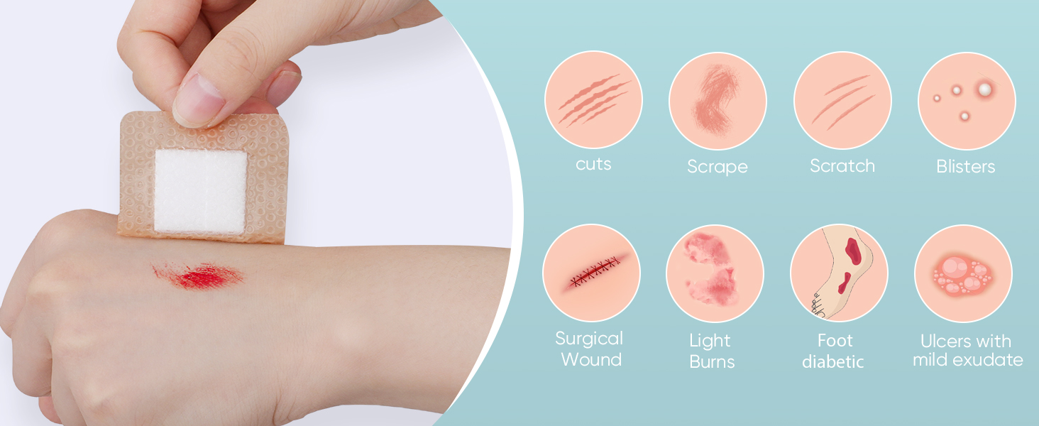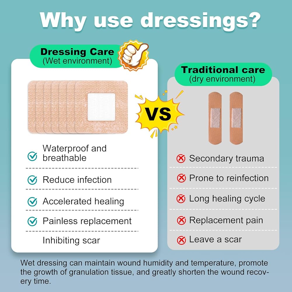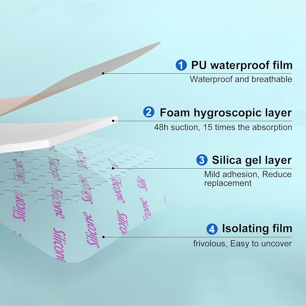 ✅GENTLE BUT SECURE ADHESION - We adopts an A+ medical-grade hypoallergenic soft silicone as a wound contact layer, it absorbs dead tissue cells, won't stick to the moist wound, while is sticky enough to stick to dry skin, minimize pain and trauma at dressings change