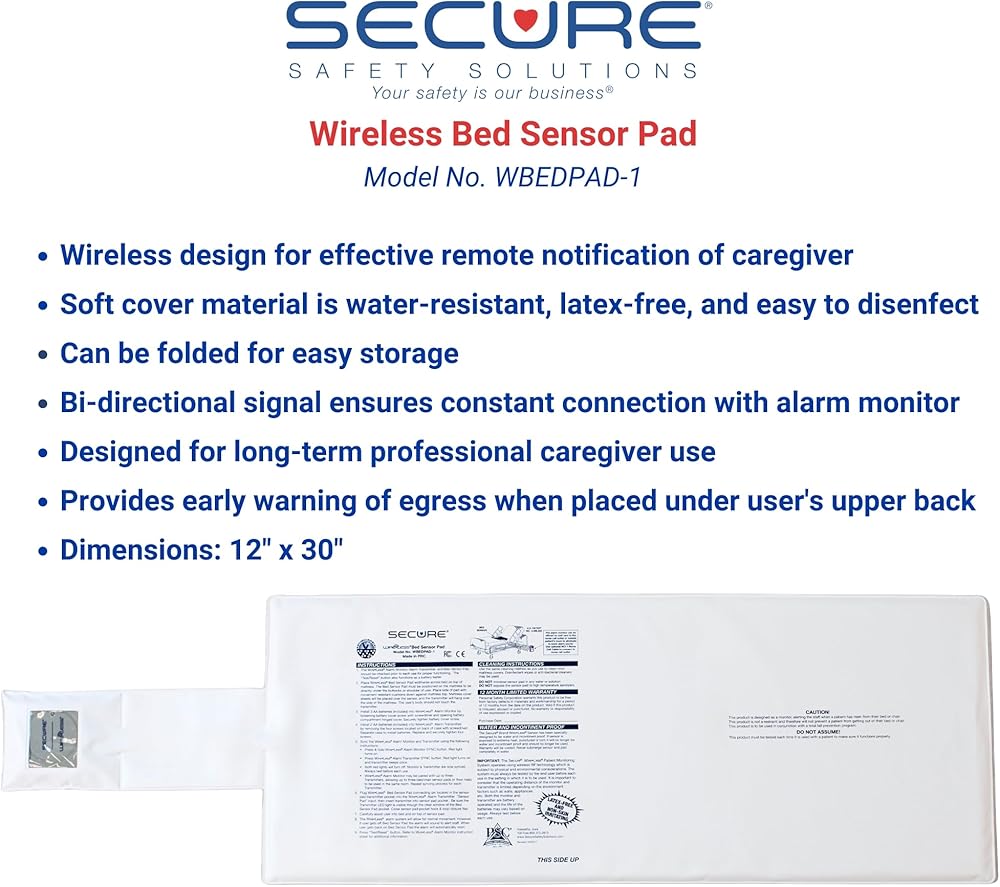 The Secure Safety Solutions Wireless Patient Monitoring System is an effective remote care fall prevention aid for caregivers that monitors elderly adults, seniors, and dementia patients by alerting nurses or caregivers when they attempt to leave the sensor pad for bed, chair, wheelchair, or floor mat in the room. Choose from a cordless bed, chair, or floor mat sensor to pair with the wireless patient alarm monitor. The wireless alarm monitors fall-risk patients in medical settings such as nursing homes, hospitals, and at home. Thousands of smart caregivers across the globe use our wireless patient monitoring system as an effective fall alert detector for elderly patient egress at the earliest stages. This wireless bed alarm system helps remotely monitor patients, seniors, elderly, special needs, and those with dementia. Prevent falls and wandering with this patient monitor remote bed alarm. A reliable bi-directional wireless connection between the alarm monitor and transmitter(s) allows caregivers to know they will receive an alert when the fall-risk patient tries to leave the bed or chair or exit a room. Purchase this elderly fall alert system with confidence, knowing that Secure Safety Solutions bed alarms for elderly have been trusted by thousands of nurses, caregivers, care homes, nursing homes, assisted living facilities, hospitals, and other health care professionals since 1991. Developing effective, high-quality elderly fall prevention, anti-wandering products, and other patient safety products is our passion. We offer the industry's best bed alarms and fall prevention for elderly, chair alarms, bed motion sensor, and door alarms. and many other safety products to meet the needs of fall-risk individuals. The Secure Wireless Patient Monitoring System advances falls management alarm monitor technology by employing the most dependable 2.4GHz bi-directional wireless communication between the sensor pad transmitter and caregiver receiver.