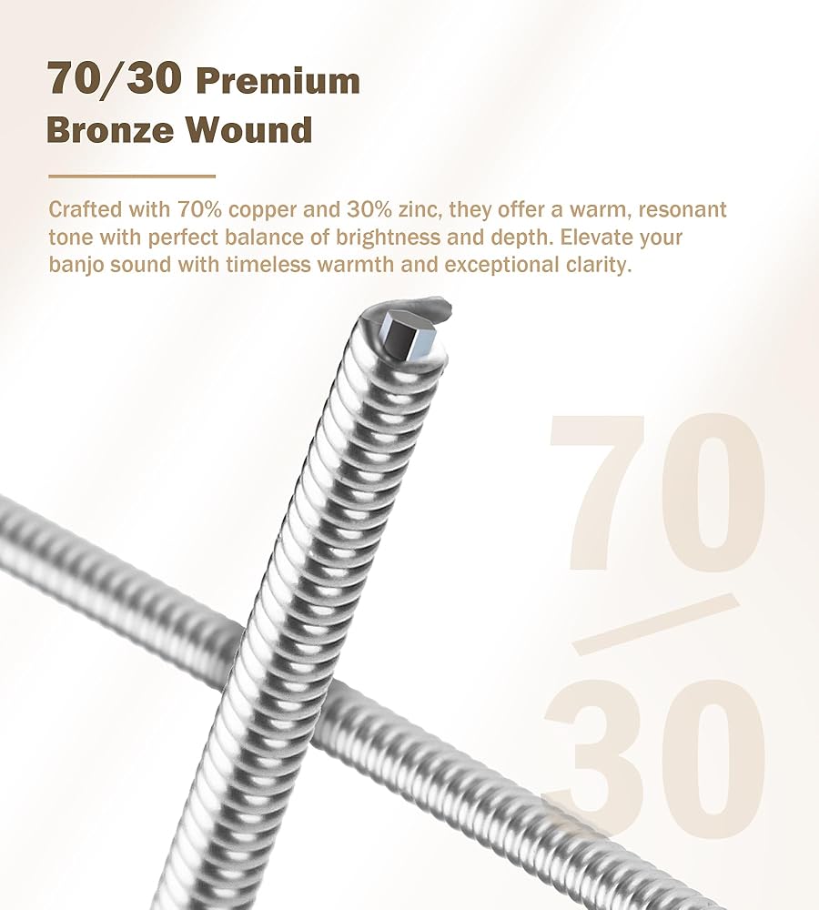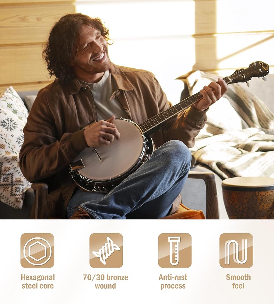 ✔Rich Tone That Last -The strings feature a 70/30 brass winding, delivering a bright, warm, and balanced sound that enhances your overall playing experience. The brass provides a clear tone with great sustain, ideal for all types of banjo music