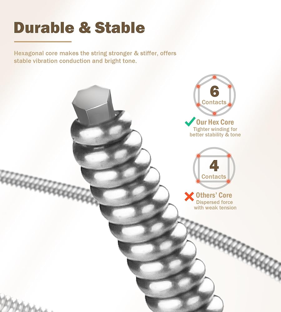 ✔Enhanced Durability with Hex Steel Core - Benefit from the hexagonal carbon steel core with 6 contact points for superior strength and stability reduce the risk of string breakage, ensuring consistent tuning and a reliable performance during every session