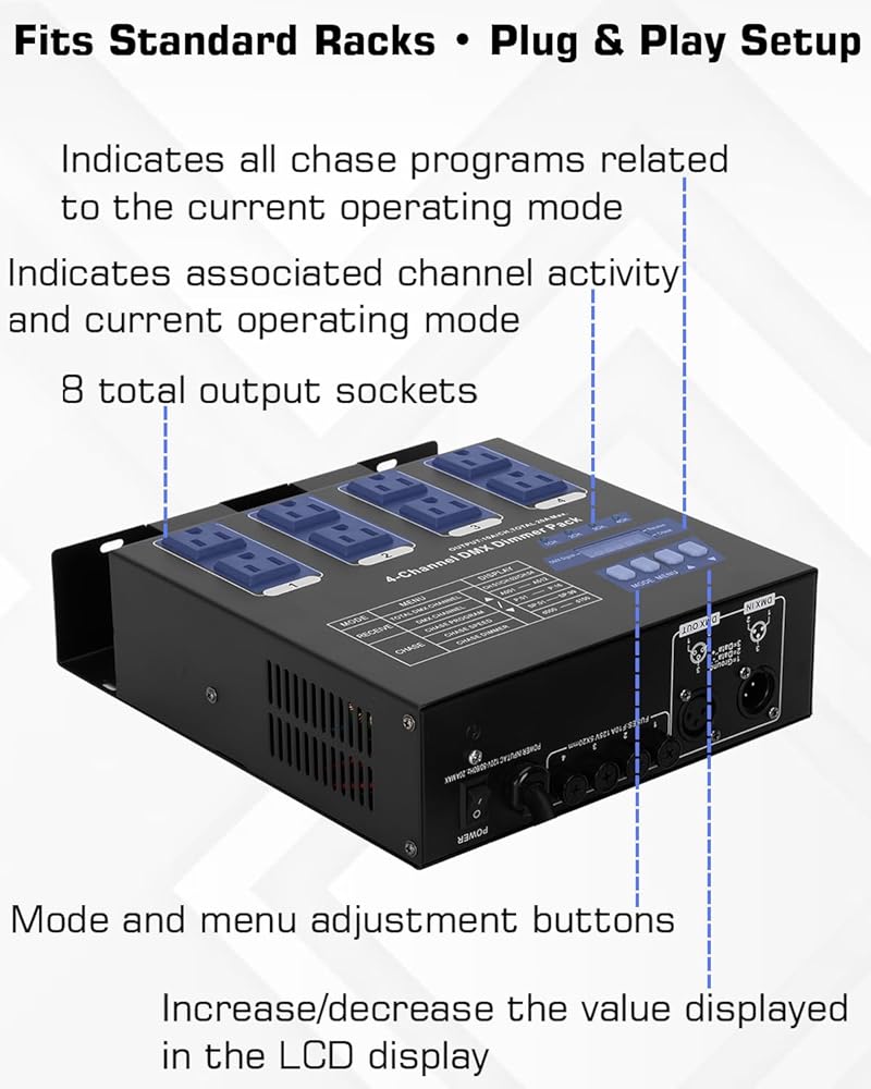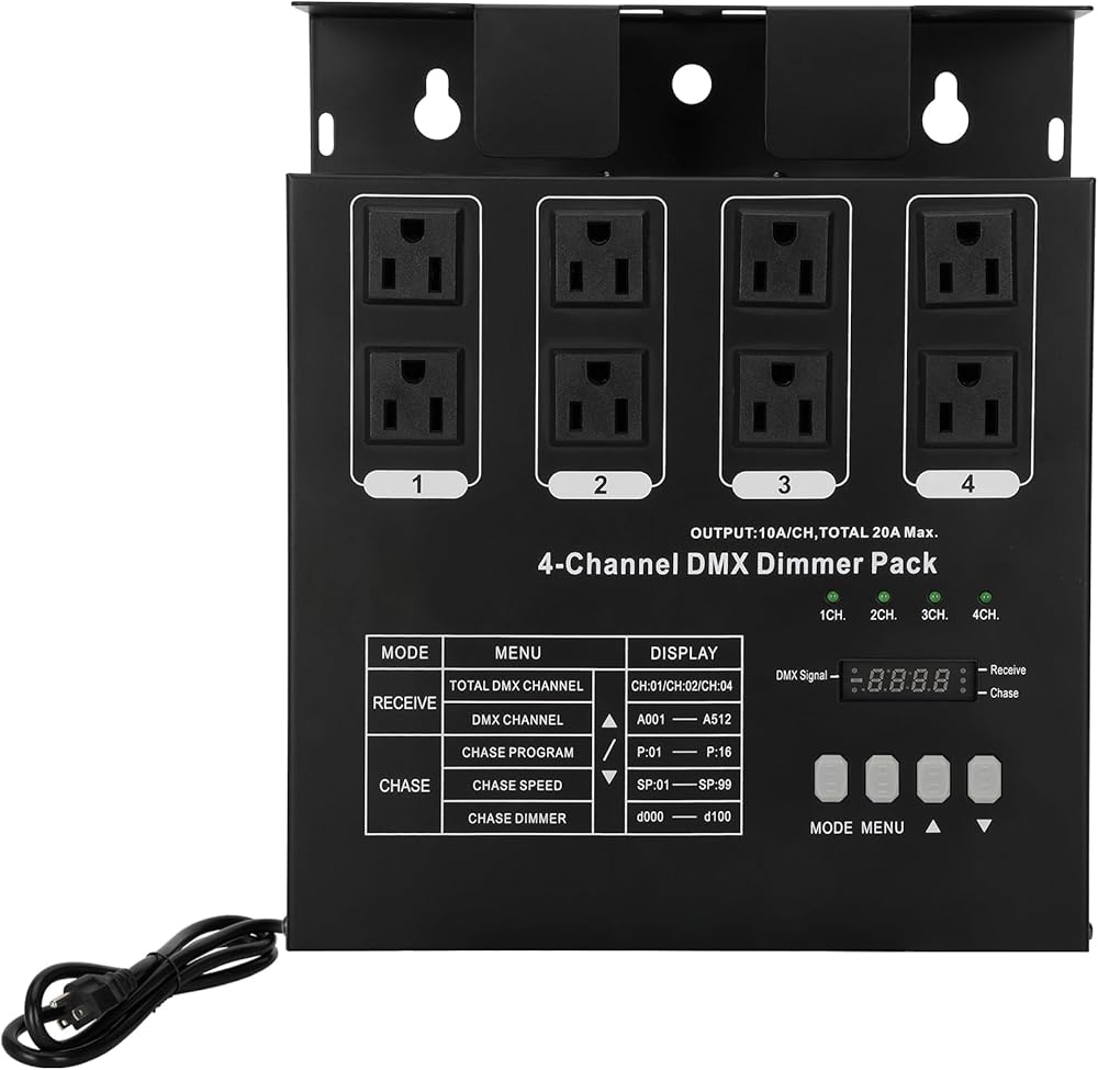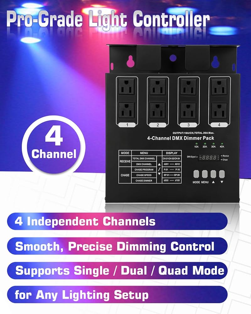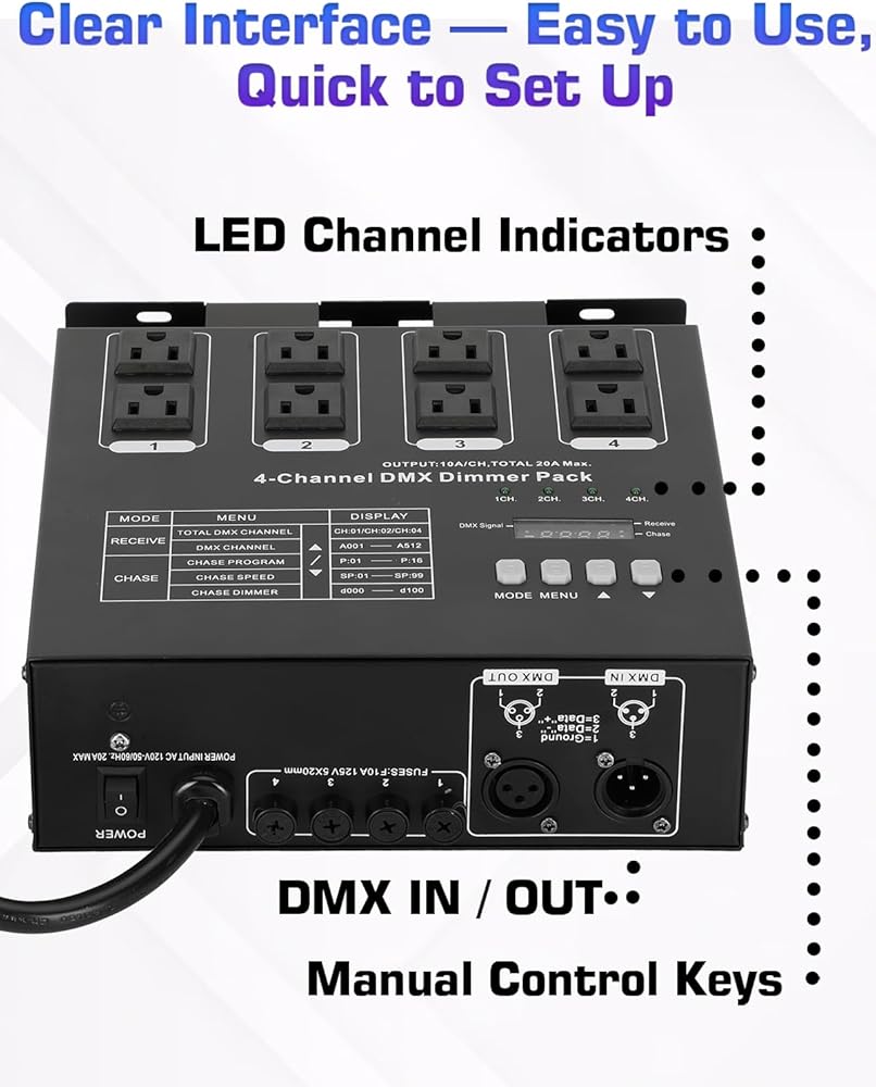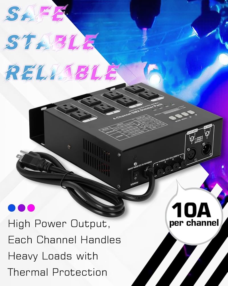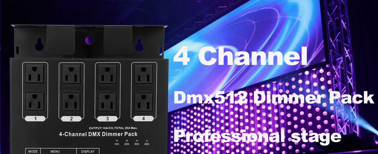 【Multi-Function】This dmx dimmer pack dimmer is equipped with four channels and eight jacks, designed to meet a variety of lighting needs. The maximum output of each channel is 10A (120V), and the total current output of the dimmer can be up to 20A (120V), enabling it to drive multiple lamps at the same time.