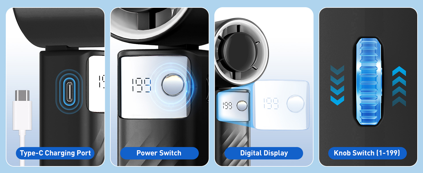 【LED Display &199 Speed Regulation】- This small fan adopts a scroll switch design and the wind speed can be adjusted from 1 to 199, which meeting your various wind power needs in any scene. And this mini fan also equipped with digital display for real-time gear and remaining power display, so you can even know the wind speed in the dark night or charge your fans in time. This USB fan is an ideal gift for women men kids