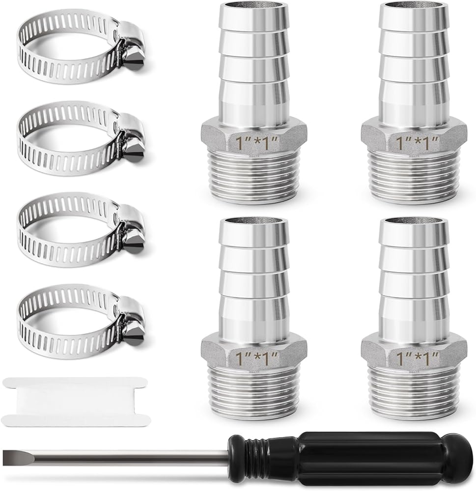 WHAT YOU GET - Come with 4pcs 1" Barb x 1" NPT stainless steel hose barb fittings, 4pcs Hose clamps, 1pc pipe sealing tape and 1pc screwdriver. Complete set of 1 npt to 1 barb for more efficient work and better leakage prevention. Warm reminder, please check if this size 1" npt to 1" hose barb meets your needs before purchasing!