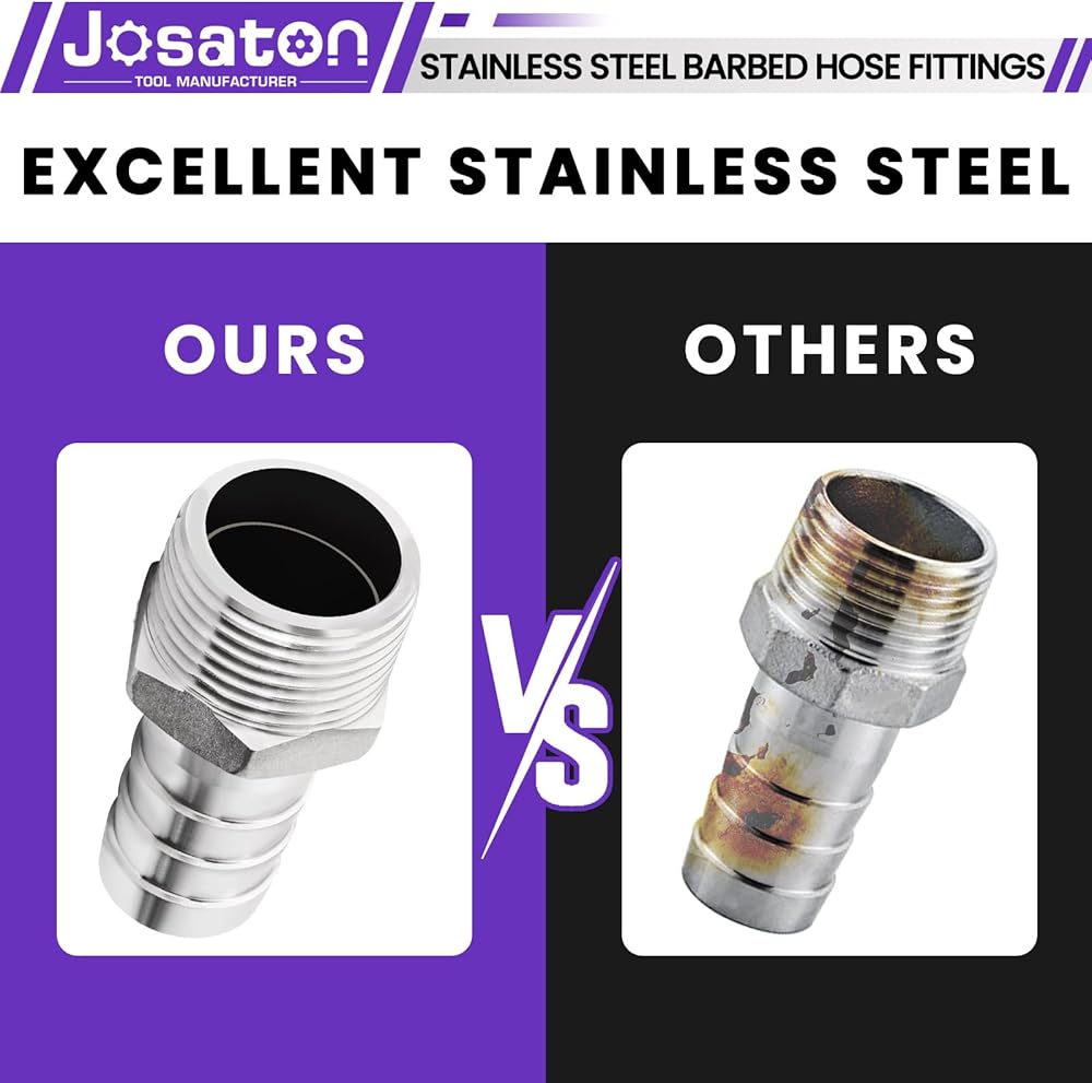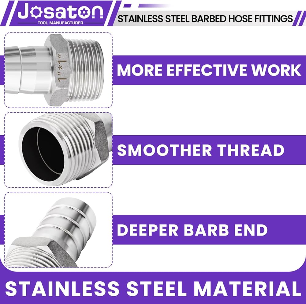 Stainless Steel Barbed Hose Fittings, Josaton stainless steel 1 barbed fitting has good corrosion and rust resistance, wear resistance, and durable, pressure and high temperature resistance, can be used in a variety of occasions and environments. 1" barbed to npt hose barb fittings. Whether you're a professional plumber or someone who likes to do their own remodeling, this 1 npt hose barb kit is ideal for you to create fulfillment in your field! NPT thread size is a nominal pipe size and it does not represent the actual diameter. Please measure your pipe by yourself first, to confirm whether this product meets your needs before purchasing!
