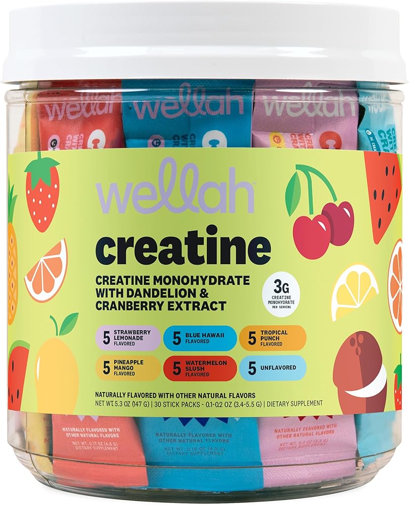 Stay consistent with your routine wherever life takes you with Wellah Creatine For Women Variety Pack Stick Packs. Each convenient, single-serve packet delivers 3g of creatine monohydrate in an easy tear-and-pour format—no scoops, no mess, no hassle. This 30-count variety pack includes six delicious options—strawberry lemonade, pineapple mango, blue hawaii, watermelon slush, tropical punch, and unflavored—so you can switch up your flavor while staying on track. The formula also features dandelion and cranberry extract for added complementary support. Perfect for busy schedules, gym bags, travel, or your desk drawer, these to-go stick packs make daily supplementation simple and portable.
