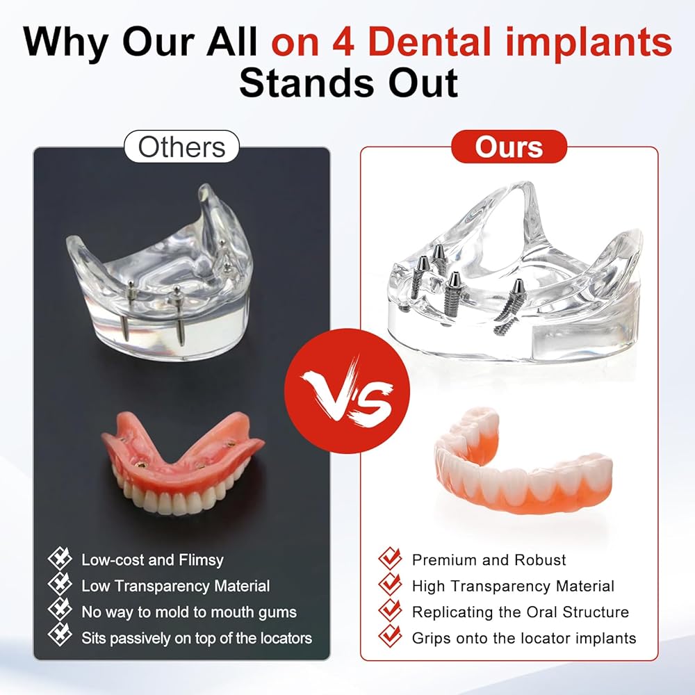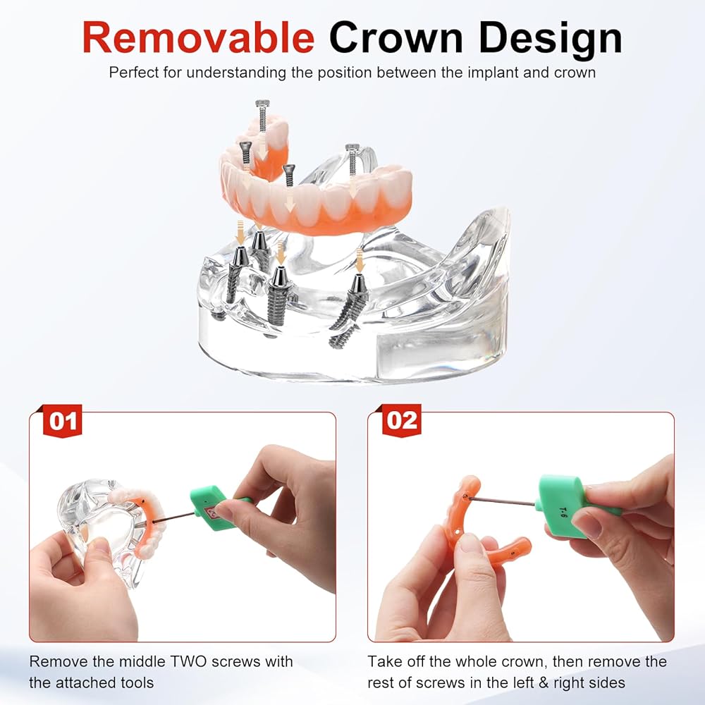 PER4MANCE All-on-4 Dental Implant Model: Includes Upper and Lower Jaw with Transparent Base, Removable Crowns for Educational Demonstration