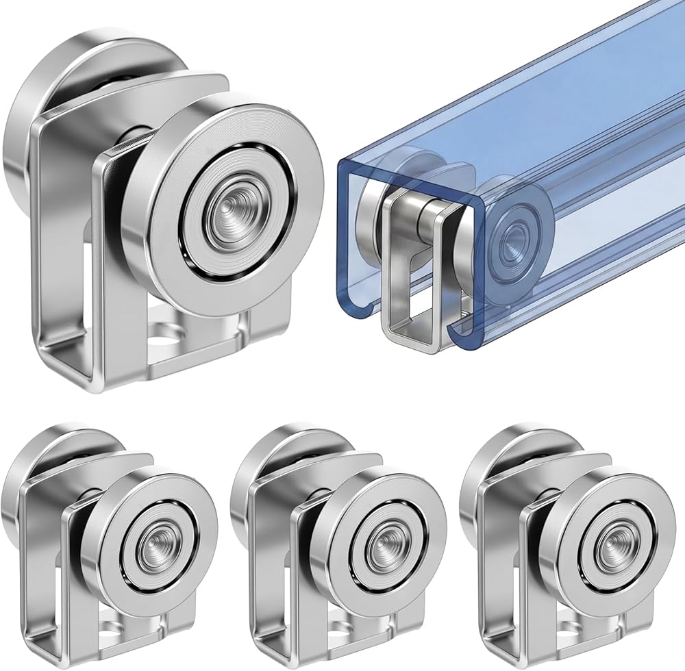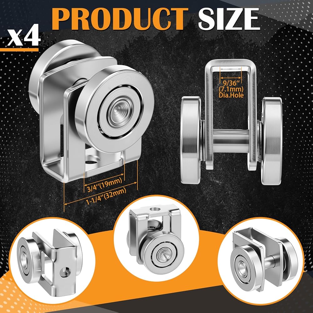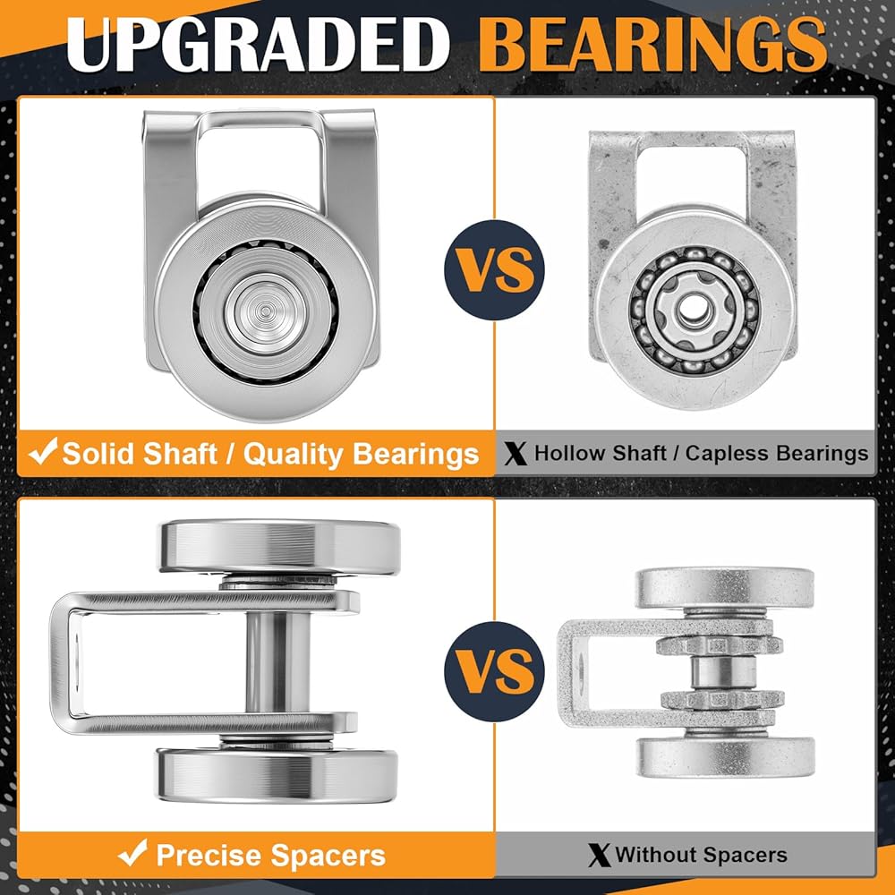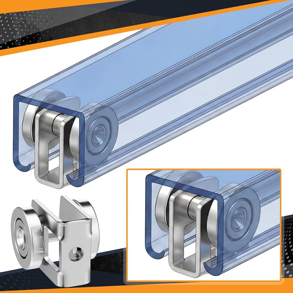 The trolley assembly rollers feature a two wheel steel construction with welded bearings and pins. This dual wheel roller trolley design offers improved load distribution and enhanced operational stability compared to single wheel alternatives, contributing to smoother movement.