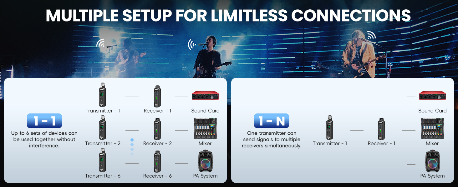 【Multiple Setup for Limitless Connections】: Designed to be both economical and user-friendly,our wireless xlr adapts to your needs. It supports a single transmitter sending signals to multiple receivers simultaneously.Otherwise,turn on one transmitter and one receiver to complete the one-to-one pairing, then power them off in the same environment.Repeat this process with the second set of devices(Up to 6 sets can be used at the same time)